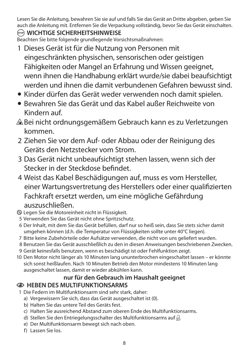 nur für den Gebrauch im Haushalt geeignet @ HEBEN DES MULTIFUNKTIONSARMS 1 Die Federn im Multifunktionsarm sind sehr stark, daher: a) Vergewissern Sie sich, dass das Gerät ausgeschaltet ist (0). b) Halten Sie das untere Teil des Geräts fest. c) Halten Sie ausreichend Abstand zum oberen Ende des Multifunktionsarms. d) Stellen Sie den Entriegelungsschalter des Multifunktionsarms auf @. e) Der Multifunktionsarm bewegt sich nach oben. f) Lassen Sie los.