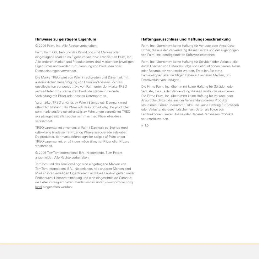 Hinweise zu geistigem Eigentum Haftungsausschluss und Haftungsbeschränkung © 2006 Palm, Inc. Alle Rechte vorbehalten. Palm, Inc. übernimmt keine Haftung für Verluste oder Ansprüche Dritter, die aus der Verwendung dieses Geräts und der zugehörigen von Palm, Inc. bereitgestellten Software entstehen. Palm, Palm OS, Treo und das Palm-Logo sind Marken oder eingetragene Marken im Eigentum von bzw. lizenziert an Palm, Inc. Alle anderen Marken und Produktnamen sind Marken der jeweiligen Eigentümer und werden zur Erkennung von Produkten oder Dienstleistungen verwendet. Die Marke TREO wird von Palm in Schweden und Dänemark mit ausdrücklicher Genehmigung von Pfizer und dessen Tochtergesellschaften verwendet. Die von Palm unter der Marke TREO vermarkteten bzw. verkauften Produkte stehen in keinerlei Verbindung mit Pfizer oder dessen Unternehmen. Varumärket TREO används av Palm i Sverige och Danmark med uttryckligt tillstånd från Pfizer och dess dotterbolag. De produkter som marknadsförs och/eller säljs av Palm under varumärket TREO ska på inget sätt alls kopplas samman med Pfizer eller dess verksamhet. TREO-varemærket anvendes af Palm i Danmark og Sverige med udtrykkelig tilladelse fra Pfizer og Pfizers associerede selskaber. De produkter, der markedsføres og/eller sælges af Palm under TREO-varemærket, er på ingen måde tilknyttet Pfizer eller Pfizers virksomhed. © 2006 TomTom International B.V., Niederlande. Zum Patent angemeldet. Alle Rechte vorbehalten. TomTom und das TomTom-Logo sind eingetragene Marken von TomTom International B.V., Niederlande. Alle anderen Marken sind Marken ihrer jeweiligen Eigentümer. Für dieses Produkt gelten unser Endbenutzer-Lizenzvereinbarung und eine eingeschränkte Garantie; im Lieferumfang enthalten. Beide können unter www.tomtom.com/ legal eingesehen werden. Palm, Inc. übernimmt keine Haftung für Schäden oder Verluste, die durch Löschen von Daten als Folge von Fehlfunktionen, leeren Akkus oder Reparaturen verursacht werden. Erstellen Sie stets Backup-Kopien aller wichtigen Daten auf anderen Medien, um Datenverlust vorzubeugen. Die Firma Palm, Inc. übernimmt keine Haftung für Schäden oder Verluste, die aus der Verwendung dieses Handbuchs resultieren. Die Firma Palm, Inc. übernimmt keine Haftung für Verluste oder Ansprüche Dritter, die aus der Verwendung dieses Produkts resultieren. Ferner übernimmt Palm, Inc. keine Haftung für Schäden oder Verluste, die durch Löschen von Daten als Folge von Fehlfunktionen, leeren Akkus oder Reparaturen dieses Produkts verursacht werden.