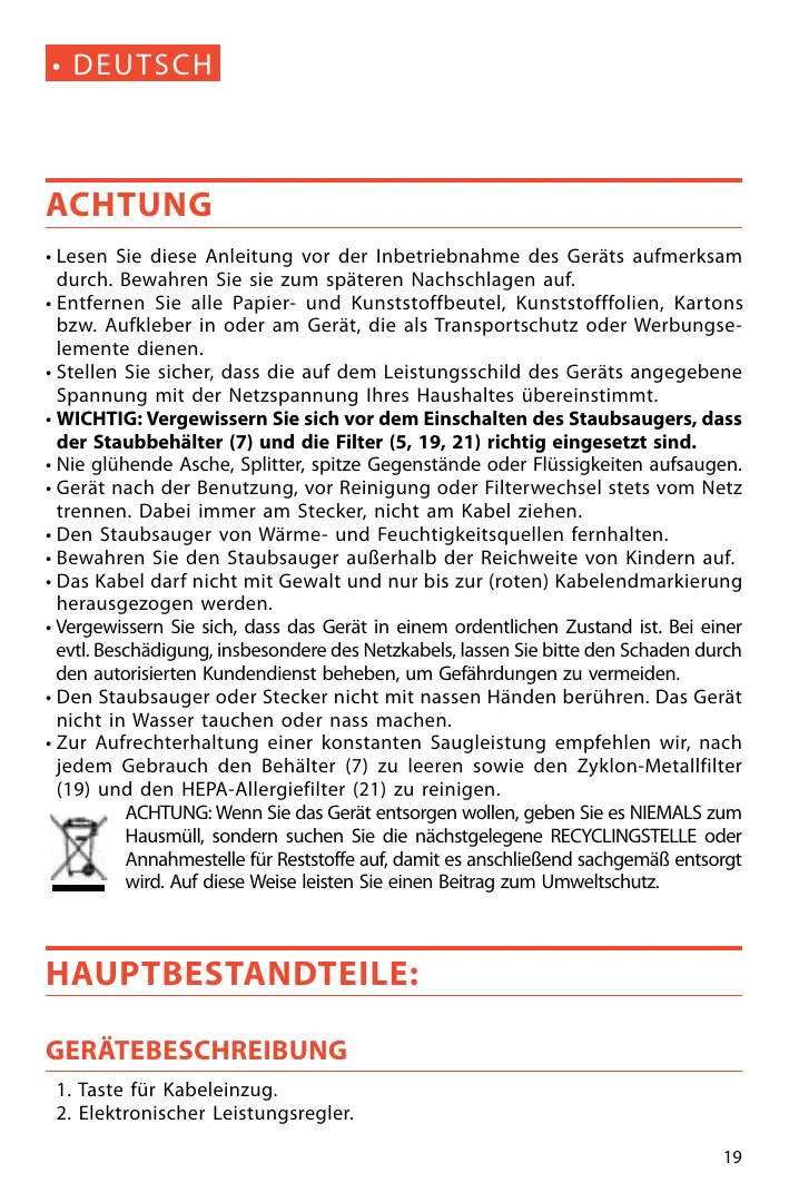 DEUTS ACHTUNG + Lesen Sie diese Anleitung vor der Inbetriebnahme des Geräts aufmerksam durch. Bewahren Sie sie zum späteren Nachschlagen auf. + Entfernen Sie alle Papier- und Kunststoffbeutel, Kunststofffolien, Kartons bzw. Aufkleber in oder am Gerät, die als Transportschutz oder Werbungse- lemente dienen. : Stellen Sie sicher, dass die auf dem Leistungsschild des Geräts angegebene Spannung mit der Netzspannung Ihres Haushaltes übereinstimmt. + WICHTIG: Vergewissern Sie sich vor dem Einschalten des Staubsaugers, dass der Staubbehälter (7) und die Filter (5, 19, 21) richtig eingesetzt sind. + Nie glühende Asche, Splitter, spitze Gegenstände oder Flüssigkeiten aufsaugen. + Gerät nach der Benutzung, vor Reinigung oder Filterwechsel stets vom Netz trennen. Dabei immer am Stecker, nicht am Kabel ziehen. + Den Staubsauger von Wärme- und Feuchtigkeitsquellen fernhalten. + Bewahren Sie den Staubsauger auBerhalb der Reichweite von Kindern auf. + Das Kabel darf nicht mit Gewalt und nur bis zur (roten) Kabelendmarkierung herausgezogen werden. + Vergewissern Sie sich, dass das Gerät in einem ordentlichen Zustand ist. Bei einer evil. Beschädigung, insbesondere des Netzkabels, lassen Sie bitte den Schaden durch den autorisierten Kundendienst beheben, um Gefährdungen zu vermeiden. + Den Staubsauger oder Stecker nicht mit nassen Händen berühren. Das Gerät nicht in Wasser tauchen oder nass machen. + Zur Aufrechterhaltung einer konstanten Saugleistung empfehlen wir, nach jedem Gebrauch den Behälter (7) zu leeren sowie den Zyklon-Metallfilter (19) und den HEPA-Allergiefilter (21) zu reinigen. ACHTUNG: Wenn Sie das Gerät entsorgen wollen, geben Sie es NIEMALS zum Hausmüll, sondemn suchen Sie die nächstgelegene RECYCLINGSTELLE oder Annahmestelle für Reststoffe auf, damit es anschlieBend sachgemäf entsorgt wird. Auf diese Weise leisten Sie einen Beitrag zum Umweltschutz. HAUPTBESTANDTEILE: GERÂTEBESCHREIBUNG