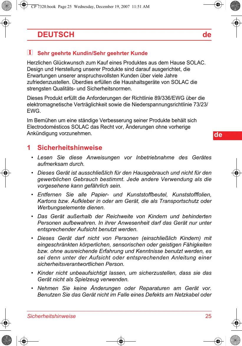 Finden Sie kostenlos die Bedienungsanleitung des Geräts CP7320 SOLAC als PDF.