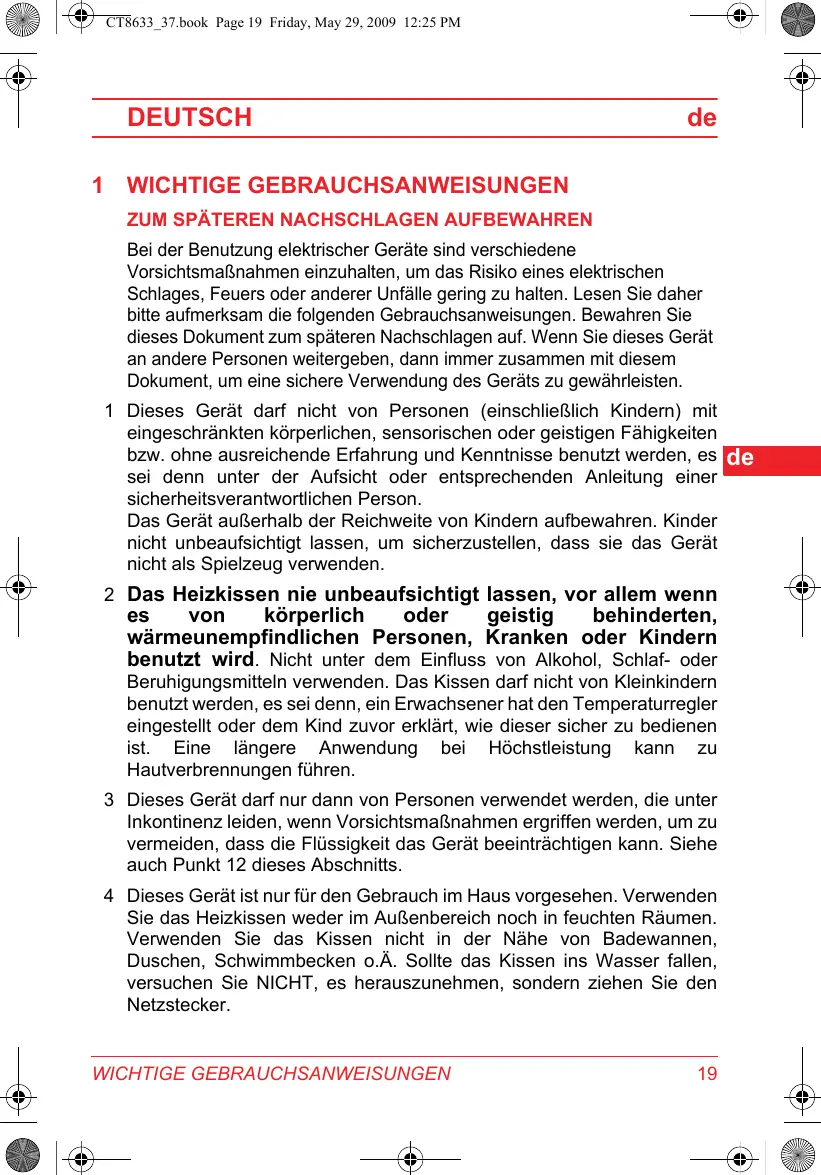 von körperlich oder geistig behinderten, wärmeunempfindlichen Personen, Kranken oder Kindern benutzt wird. Nicht unter dem Einfluss von Alkohol, Schlaf- oder Beruhigungsmitteln verwenden. Das Kissen darf nicht von Kleinkindern benutzt werden, es sei denn, ein Erwachsener hat den Temperaturregler eingestellt oder dem Kind zuvor erklärt, wie dieser sicher zu bedienen ist. Eine längere Anwendung bei Höchstleistung kann zu Hautverbrennungen führen. 3 Dieses Gerät darf nur dann von Personen verwendet werden, die unter Inkontinenz leiden, wenn Vorsichtsmaßnahmen ergriffen werden, um zu vermeiden, dass die Flüssigkeit das Gerät beeinträchtigen kann. Siehe auch Punkt 12 dieses Abschnitts. 4 Dieses Gerät ist nur für den Gebrauch im Haus vorgesehen. Verwenden Sie das Heizkissen weder im Außenbereich noch in feuchten Räumen. Verwenden Sie das Kissen nicht in der Nähe von Badewannen, Duschen, Schwimmbecken o.Ä. Sollte das Kissen ins Wasser fallen, versuchen Sie NICHT, es herauszunehmen, sondern ziehen Sie den Netzstecker. WICHTIGE GEBRAUCHSANWEISUNGEN
