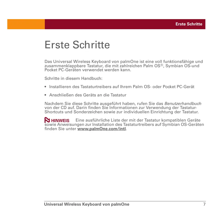 Universal Wireless Keyboard by palmOne Erste Schritte Erste Schritte Das Universal Wireless Keyboard von palmOne ist eine voll funktionsfähige und zusammenklappbare Tastatur, die mit zahlreichen Palm OS®, Symbian OS-und Pocket PC-Geräten verwendet werden kann. Schritte in diesem Handbuch: