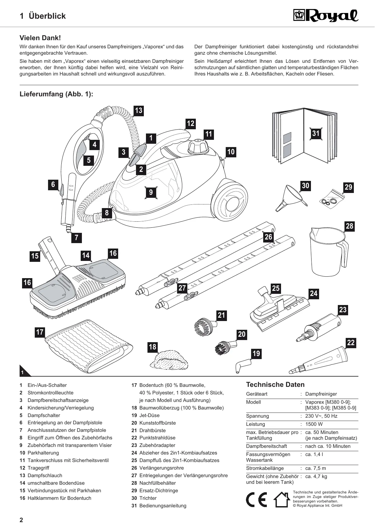 1 Überblick Vielen Dank! Wir danken Ihnen für den Kauf unseres Dampfreinigers ,Vaporex* und das entgegengebrachte Vertrauen. Sie haben mit dem .Vaporex" einen vielseitig einsetzbaren Dampfreiniger erworben, der Ihnen Künftig dabei helfen wird, eine Vielzahl von Reini- gungsarbeiten im Haushalt schnell und wirkungsvoll auszuführen Hièoyal Der Dampfreiniger funktioniert dabei kostengünstig und rückstandsfrei ganz ohne chemische Lésungsmittel. Sein Heifdampf erleichtert Innen das Lôsen und Entfemen von Ver- schmutzungen auf sämtlichen glatten und temperaturbeständigen Flächen Ihres Haushalts wie z. B. Arbeitsflächen, Kacheln oder Fliesen. Lieferumfang (Abb. 1): Ein-/Aus-Schalter Stromkontrollleuchte Dampfbereitschaftsanzeige Kindersicherung/Verriegelung Dampfschalter Entriegelung an der Dampfpistole Anschlussstutzen der Damppistole Eingriff zum Ôffnen des Zubehôrfachs 9 Zubehôrfach mit transparentem Visier 10 Parkhalterung 11 Tankverschluss mit Sicherheitsventil 12 Tragegriff 13 Dampfschlauch 14 umschaltbare Bodendüse 15 Verbindungsstück mit Parkhaken 16 Haltklammern für Bodentuch œ No ump w N = 17 Bodentuch (60 % Baumwolle, 40 % Polyester, 1 Stück oder 6 Stück, je nach Modell und Ausführung) 18 Baumwollüberzug (100 % Baumwolle) 19 Jet-Düse 20 Kunststoffbürste 21 Drahtbürste 22 Punktstrahidüse 23 Zubehôradapter 24 Abzieher des 2in1-Kombiaufsatzes 25 DampfiuB des 2ini-Kombiaufsatzes 26 Verlängerungsrohre 27 Entregelungen der Verlängerungsrohre 28 Nachfüllbehälter 29 Ersatz-Dichtringe 30 Trichter 31 Bedienungsanieitung Technische Daten Geräteart Dampfreiniger Modell Vaporex [M380 0-9]: [M383 0-9]; [M385 0-9] Spannung 230 V=, 50 Hz Leistung 1500 W max. Betriebsdauer pro : ca. 50 Minuten Tankfüllung Ge nach Dampfeinsatz) Damptbereitschaft nach ca. 10 Minuten Fassungsvermôgen ca. T4T Wassertank Stromkabellänge ca.7,5m Gewicht (ohne Zubehôr : ca. 4,7 kg und bei leerem Tank) Technische und gestalterische Ande- rungen im Zuge stetiger Produkiver- besserungen vorbehalten: Royal Appliance Int. GmbH