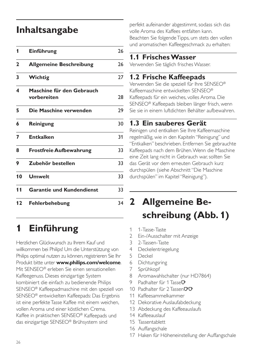 12 Fehlerbehebung x 2 Allgemeine Be- 1 Einführung Herzlchen Glückwunsch zu Ihrem Kauf und willkommen bei Philips! Um die Unterstützung von Philips optimal nutzen zu kônnen, registrieren Sie Inr Produkt bitte unter www.philips.com/welcome. Mit SENSEO® erleben Sie einen sensationellen Kaffeegenuss. Dieses einzigartige System kombiniert die einfach zu bedienende Philips SENSEO® Kaffeepadmaschine mit den speziell von SENSEO® entwickelten Kaffeepads: Das Ergebnis ist eine perfekte Tasse Kaffee mit einem weichen, vollen Aroma und einer kôstlichen Crema. Kafee in praktischen SENSEO® Kaffeepads und das einzigartige SENSEO® Brühsystem sind schreibung (Abb. 1) 1 1-Tasse-Taste 2 Ein-Ausschalter mit Anzeige