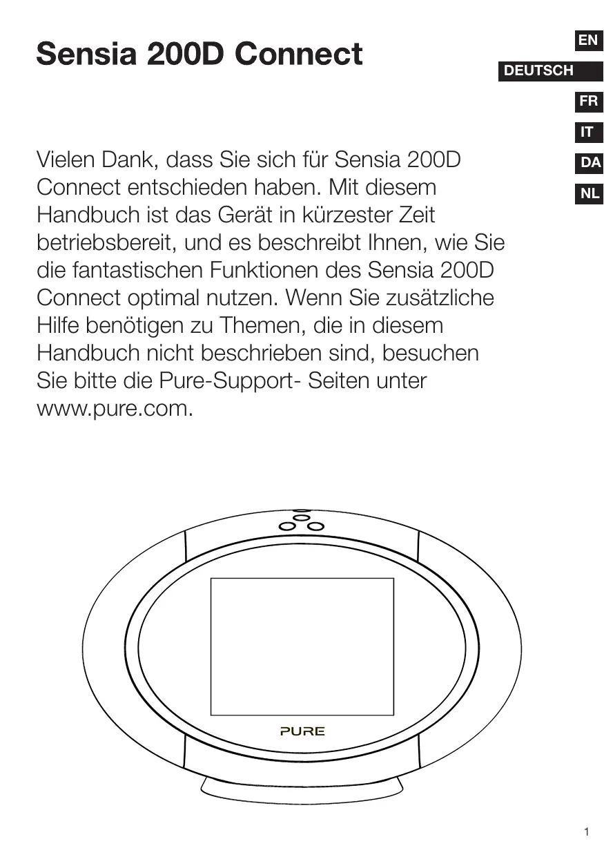 Vielen Dank, dass Sie sich für Sensia 200D Connect entschieden haben. Mit diesem Handbuch ist das Gerät in kürzester Zeit betriebsbereit, und es beschreibt Ihnen, wie Sie die fantastischen Funktionen des Sensia 200D Connect optimal nutzen. Wenn Sie zusätzliche Hilfe benötigen zu Themen, die in diesem Handbuch nicht beschrieben sind, besuchen Sie bitte die Pure-Support- Seiten unter www.pure.com.