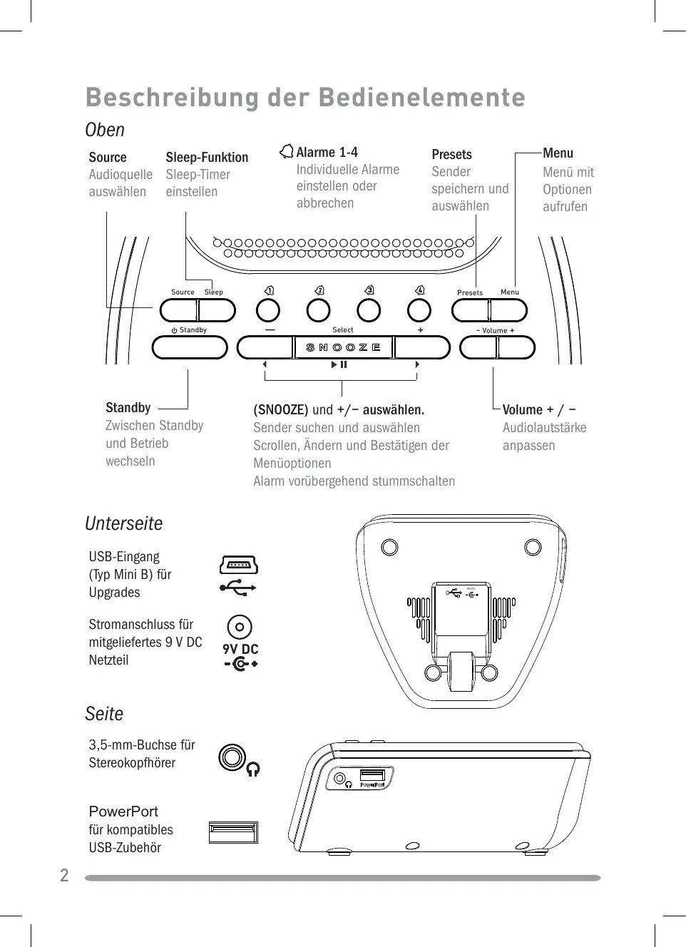 Volume + / − Audiolautstärke anpassen Unterseite Stromanschluss für mitgeliefertes 9 V DC Netzteil Seite 3,5-mm-Buchse für Stereokopfhörer PowerPort für kompatibles USB-Zubehör