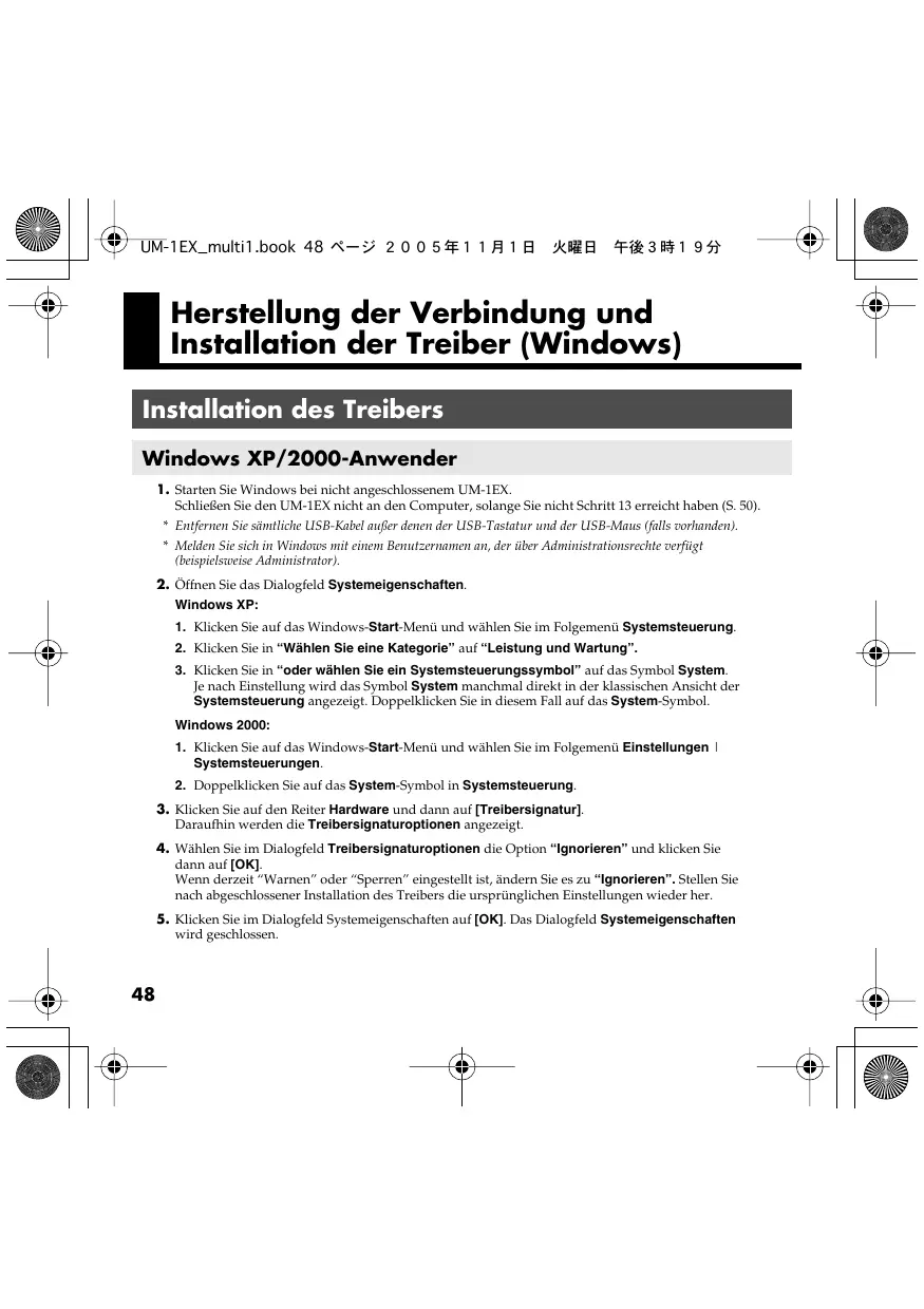 - Starten Sie Windows bei nicht angeschlossen UM-1EX. Schlieben Sie den UM-1EX nicht an den Computer, solange Sie nicht Schritt 13 errecht haben (S. 50).