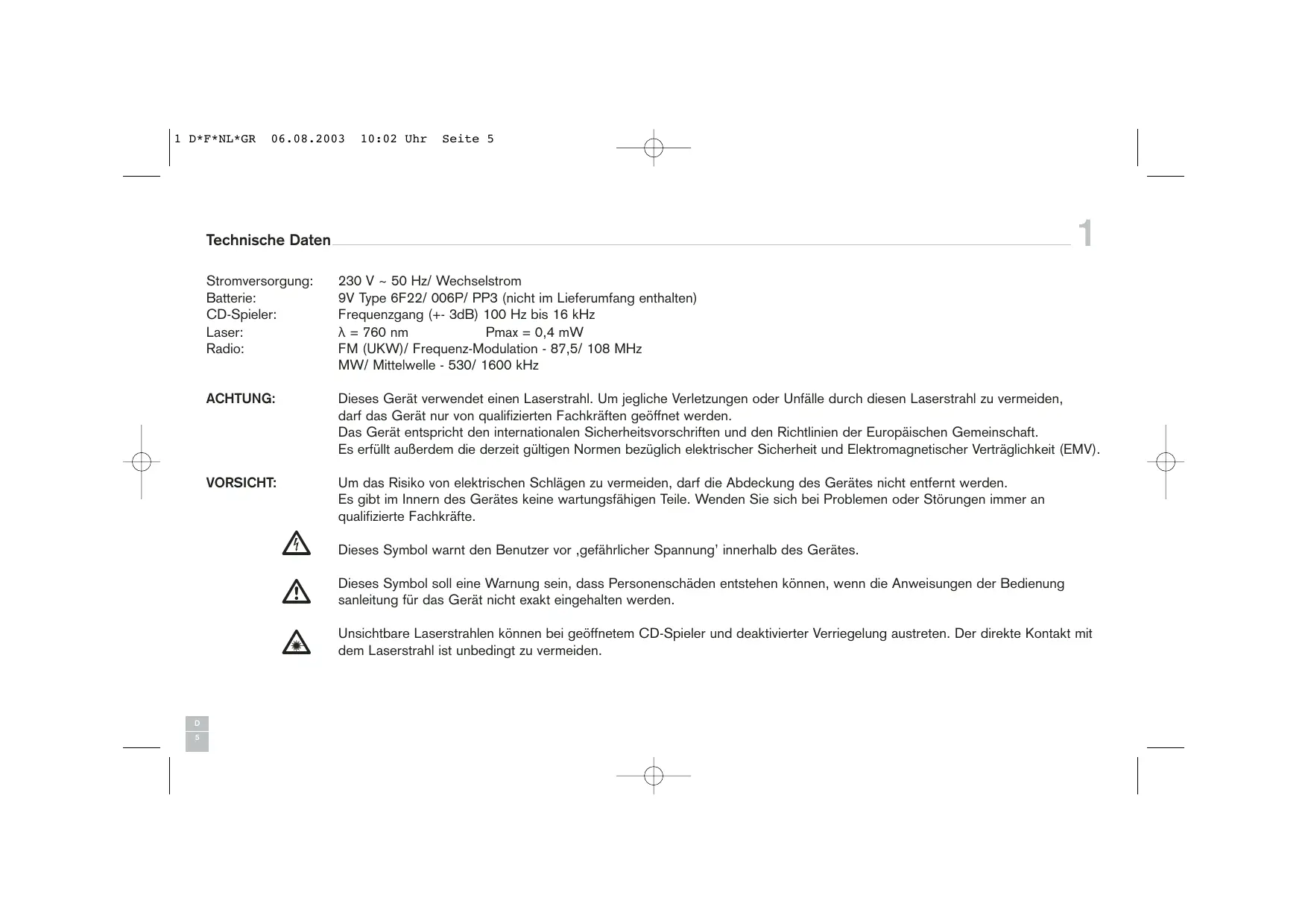 ACHTUNG: Dieses Gerät verwendet einen Laserstrahl. Um jegliche Verletzungen oder Unfälle durch diesen Laserstrahl zu vermeiden, darf das Gerät nur von qualifizierten Fachkräften geöffnet werden.
