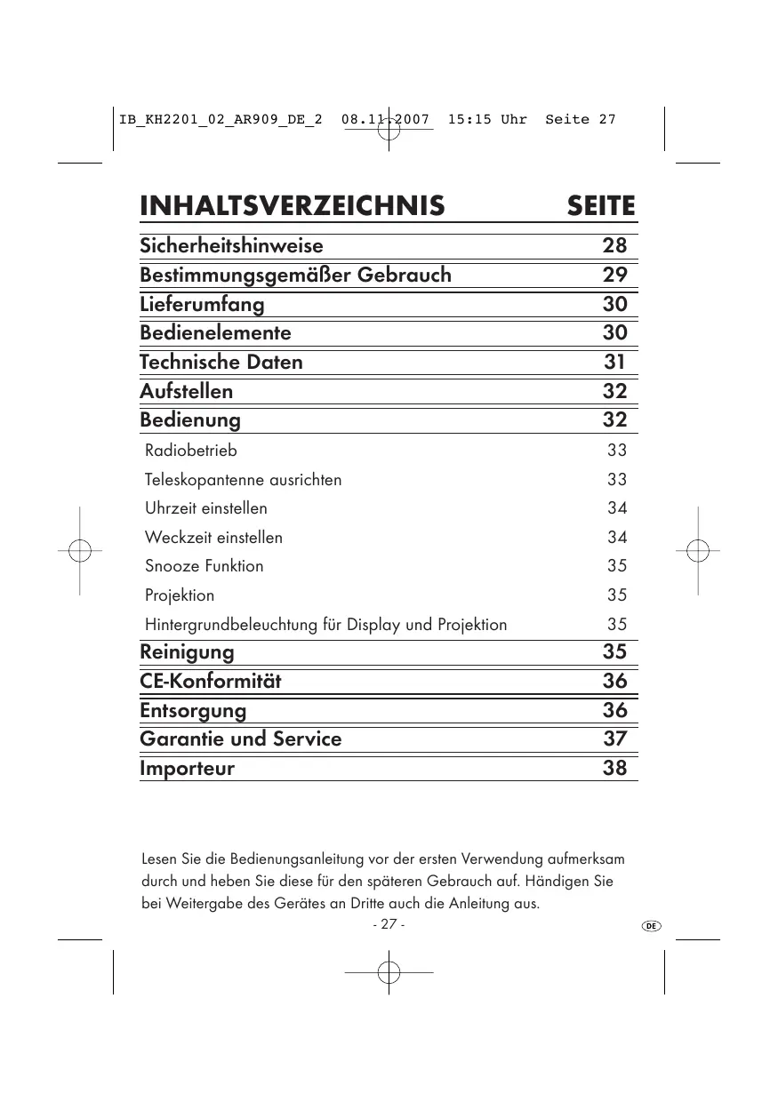 Laden Sie die Anleitung für Ihr Projektionsuhr kostenlos im PDF-Format! Finden Sie Ihr Handbuch KH 2001 PROJECTION CLOCK - EBENCH und nehmen Sie Ihr elektronisches Gerät wieder in die Hand. Auf dieser Seite sind alle Dokumente veröffentlicht, die für die Verwendung Ihres Geräts notwendig sind. KH 2001 PROJECTION CLOCK von der Marke EBENCH.