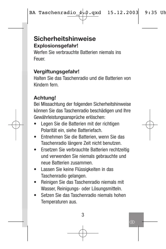 Bei Missachtung der folgenden Sicherheitshinweise konnen Sie das Taschenradio beschädigend und ihre Gewährleistungsansprüche erlösen: