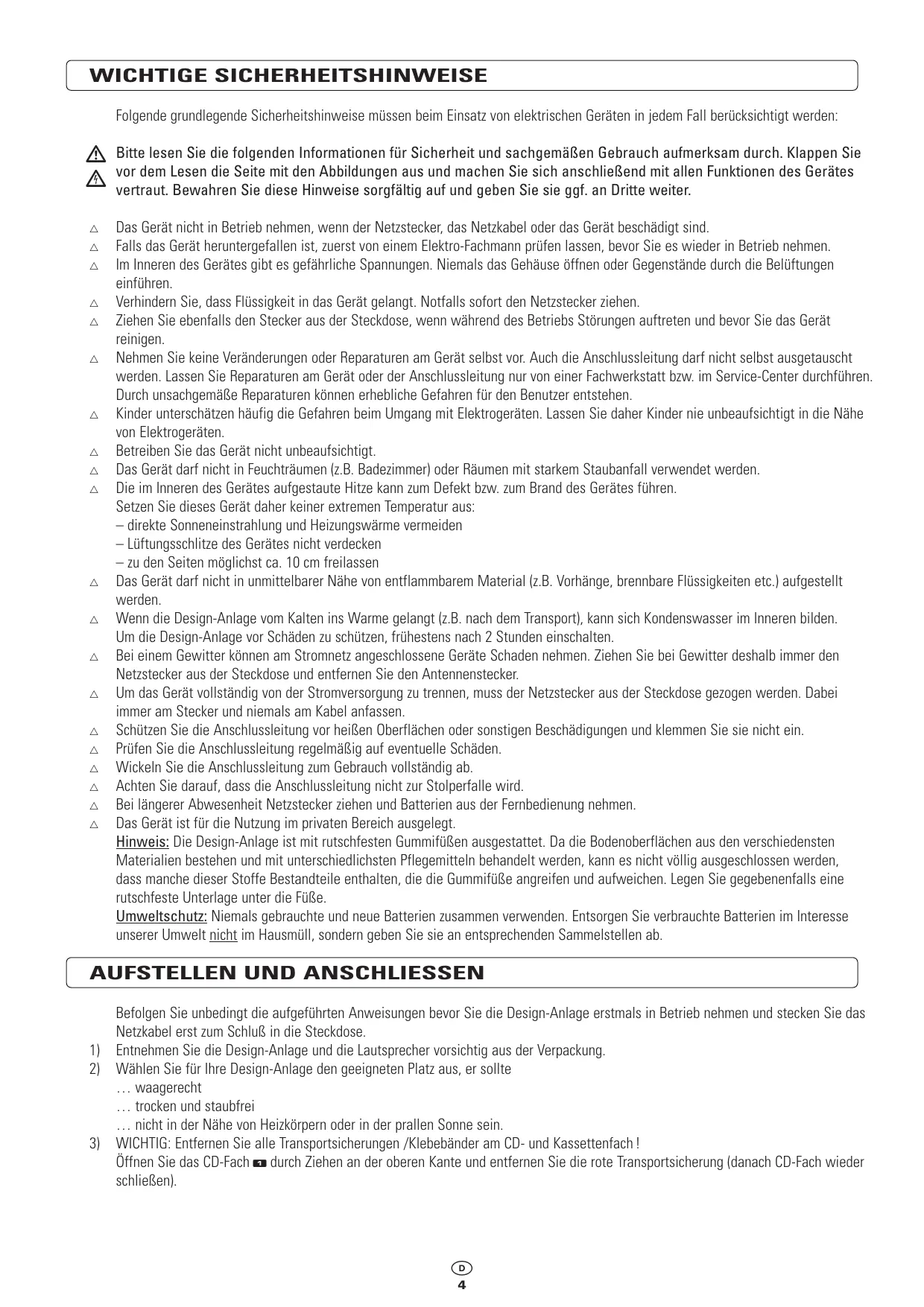Ne pas mettre l'appareil en service si la prise, le cordon ou l'appareil sont endommagés. Si l'appareil est tombé, le faire contrôler au préalable par un électricien spécialisé avant de le remettre en service. L'intérieur de l'appareil est soumis à des tensions dangereuses. Ne jamais ouvrir le boîtier ni introduire des objets par les trous d'aérations. Evitez de faire pénétrer des liquides dans l'appareil. Si nécessaire, débrancher la prise. Débranchez également la prise de la prise murale en cas d'apparition de défauts pendant le fonctionnement de l'appareil et avant de nettoyer l'appareil. Ne procédez vous-même à aucunes modifications ni réparations de l'appareil. De même, ne remplacez pas vous-même le cordon de raccordement. Ne faites procéder à toutes réparations de l'appareil ou du cordon de raccordement que par un atelier spécialisé ou un centre SAV. Toute réparation incorrecte peut être la source de dangers importants pour l'utilisateur. Les enfants sous-estiment souvent les dangers lors de la manipulation d'appareils électriques. Ne laissez donc jamais des enfants à proximité d'appareils électriques sans surveillance. Ne laissez pas l'appareil sans surveillance pendant le fonctionnement. Ne pas utiliser l'appareil dans les lieux humides (par exemple salles de bain) ou soumis à une poussière importante. La chaleur accumulée à l'intérieur de l'appareil peut entraîner une panne ou un incendie. N'exposez donc pas l'appareil à des températures extrêmes: – éviter les rayons directs du soleil et la chaleur du chauffage – ne pas boucher ou recouvrir les fentes d'aération de l'appareil – dans la mesure du possible, laisser 10 cm de libre par rapport aux côtés de l'appareil Ne pas installer l'appareil à proximité immédiate de matériaux inflammables (par exemple rideaux, liquides inflammables etc...). Si la chaîne est transportée d'un lieu froid dans un lieu chaud (par exemple après le transport), il peut se former une condensation à l'intérieur. Pour ne pas endommager la chaîne, attendre au moins 2 heures avant de la mettre en marche. Lors d'un orage, les appareils raccordés au secteur peuvent être endommagés. En cas d'orage, débranchez donc la prise de la prise murale et débranchez également la prise de l'antenne. Pour que l'appareil soit coupé complètement de l'alimentation électrique, il faut absolument débrancher la prise de la prise murale. Ce faisant, saisir la prise et jamais le cordon. Protégez le cordon de raccordement de tout contact avec des surfaces chaudes et de tous autres endommagements et veillez à ne pas le coincer. Contrôlez régulièrement le cordon de raccordement en vue de détecter d'éventuels endommagements. Lors de l'utilisation, déroulez complètement le cordon. Veillez à ce qu'il ne soit pas possible de trébucher sur le cordon de raccordement. En cas d'absence prolongée, débrancher la prise et retirer les piles de la télécommande. L'appareil est conçu pour un usage domestique. Avis: La chaîne est équipée de pieds en caoutchouc antidérapants. Etant donné que les sols peuvent être constitués des matériaux les plus divers et traités avec les produits d'entretien les plus divers, il ne peut être entièrement exclu que certaines de ces substances contiennent des composants susceptibles d'attaquer et de ramollir les pieds en caoutchouc. Le cas échéant, posez un support antidérapant sous les pieds. Protection de l'environnement: Ne jamais mélanger des piles usagées et des piles neuves. Dans l'intérêt de notre environnement, n'éliminez pas les piles usagées dans les ordures ménagères, mais remettez-les à des centres de collecte correspondants.