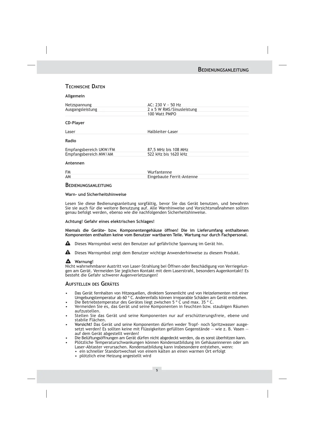 Installez l’appareil sur une base solide et plane. L’appareil doit être installé de telle façon qu’une aération suffisante soit garantie. L’espace laissé entre le côté arrière de l’appareil et le mur devrait être de 10 cm minimum, l’écartaudessus de l’appareil, également, de 10 cm minimum et l’écart latéral, de chaque côté, de 5 cm minimum. Par conséquent, n’installez pas l’appareil dans une bibliothèque, dans un autre meuble fermé ou sur une étagère surchargée. L’aération est également insuffisante lorsque l’appareil est placé sur un lit, une couverture ou dans des conditions similaires. Veillez à ce qu’aucun corps étranger ou liquide ne pénètre dans l’appareil par les orifices d’aération. Le détecteur laser du lecteur de CD peut s’humidifier, lorsque :