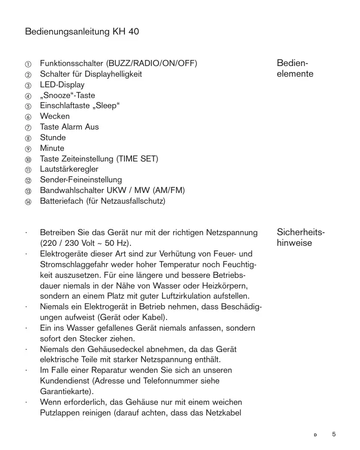 BEDIENUNGSANLEITUNG KH 40 RADIO ALARM CLOCK EBENCH