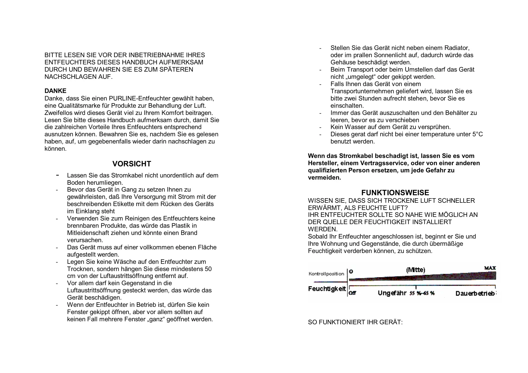 DANKE Danke, dass Sie einen PURLINE-Entfeuchter gewählt haben, eine Qualitätsmarke für Produkte zur Behandlung der Luft. Zweifellos wird dieses Gerät viel zu Ihrem Komfort beitragen. Lesen Sie bitte dieses Handbuch aufmerksam durch, damit Sie die zahlreichen Vorteile Ihres Entfeuchters entsprechend ausnutzen können. Bewahren Sie es, nachdem Sie es gelesen haben, auf, um gegebenenfalls wieder darin nachschlagen zu können. VORSICHT