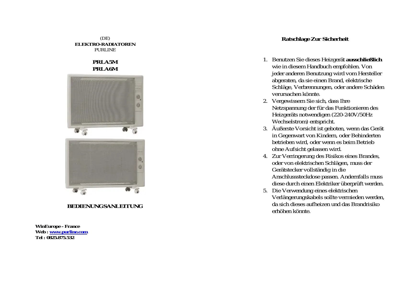 Laden Sie die Anleitung für Ihr Elektrische Heizung kostenlos im PDF-Format! Finden Sie Ihr Handbuch PRLA6M - PUR LINE und nehmen Sie Ihr elektronisches Gerät wieder in die Hand. Auf dieser Seite sind alle Dokumente veröffentlicht, die für die Verwendung Ihres Geräts notwendig sind. PRLA6M von der Marke PUR LINE.