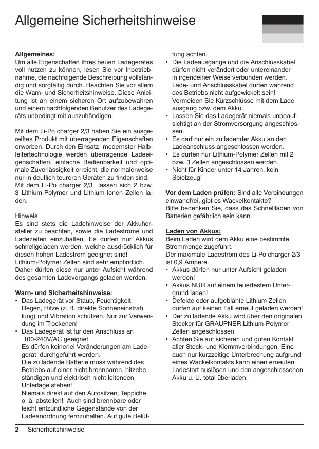 - Achten Sie auf sicheren und guten Kontakt aller Steck- und Klemmverbindungen. Eine auch nur kurzzeitige Unterbrechung aufgrund eines Wackelkontakts kann einen erneuten Ladestart auslösen und den angeschlossenen Akku u. U. total überladen. Allgemeine Betriebshinweise Lithium-Polymer Zellen: Der Li-Po charger 2/3 ist nur zum Laden von Lithium-Polymer-Akkus mit einer Zellen Nennspannung von 3,7 V/Zelle geeignet. Lithium-Akkus zeichnen sich vor allem durch ihre, im Vergleich zu anderen Akkutypen, wesentlich höhere Kapazität aus. Dieser wesentliche Vorteil auf der einen Seite erfordert jedoch andere Behandlungsmethoden in Bezug auf die Ladung / Entladung sowie für einen gefahrlosen Betrieb. Die hier grundlegenden Vorschriften müssen auf alle Fälle beachtet werden. Weitere entsprechende Angaben und Sicherheitshinweise entnehmen sie bitte den technischen Angaben des Akkuherstellers. Prinzipiell können Akkus auf Lithiumbasis NUR mit speziellen Ladegeräten geladen werden, die auf den jeweiligen Akkutyp (Ladeschlussspannung, Kapazität) eingestellt sind. Die Aufladung erfolgt anders als bei NiCd- oder NiMH-Akkus durch eine sog. Konstantstrom/Konstantspannungs-Methode. Der für die Ladung erforderliche Ladestrom ergibt sich aus der Akkukapazität und wird vom Ladegerät automatisch eingestellt. Lithiumakkus werden gewöhnlich mit 1-2 C Ladestrom aufgeladen (1 C Ladestrom = Kapazitäts-Ladestrom. Beispiel: bei einer Kapazität von z. B.: 1500 mAh ist der entsprechende 1 C Ladestrom = 1500 mA = 1,5A). Der Li-Po charger 2/3 bis maximal 0,9 Ampere, sodass eine Einstellung überflüssig ist und bei diesem Lader bewusst weggelassen wurde. Wird die zum jeweiligen Akkutyp gehörende, spezifische Ladeschlussspannung erreicht, wird der Ladestrom automatisch reduziert, um ein Überschreiten der Ladeschlussspannung zu verhindern. Haftungsausschluss: Die Einhaltung der Betriebsanleitung sowie die Bedingungen und Methoden bei Installation, Betrieb, Verwendung und Wartung des Ladegerätes können von der Fa. GRAUPNER nicht überwacht werden. Daher übernimmt die Fa. GRAUPNER keinerlei Haftung für Verluste, Schäden oder Kosten, die sich aus fehlerhafter Verwendung und Betrieb ergeben oder in irgendeiner Weise damit zusammenhängen. Komponenten und Zubehör: Die Firma GRAUPNER GmbH & Co. KG als Hersteller empfiehlt, Komponenten und Zubehörprodukte zu verwenden, die von GRAUPNER auf Tauglichkeit, Funktion und Sicherheit geprüft, freigegeben sind.GRAUPNER übernimmt für Sie die Produktverantwortung. Die Fa. GRAUPNER übernimmt für nicht freigegebene Teile oder Zubehörprodukte von anderen Herstellern keine Haftung und kann nicht jedes einzelne Fremdprodukt beurteilen, ob es ohne Sicherheitsrisiko eingesetzt werden kann. Hinweise zum Umweltschutz: Das Symbol auf dem Produkt, der Gebrauchsanleitung oder der Verpackung weist darauf hin, dass dieses Produkt bzw. elektronische Teile davon am Ende seiner Lebensdauer nicht über den normalen Haushaltsabfall entsorgt werden dürfen. Es muss an einem Sammelpunkt für das Recycling von elektrischen und elektronischen Geräten abgegeben werden. Die Werkstoffe sind gemäß ihrer Kennzeichnung wiedeverwertbar. Mit der Wiederverwendung, der stofflichen Verwertung oder anderen Formen der Verwertung von Altgeräten leisten Sie einen wichtigen Beitrag zum Umweltschutz. Batterien und Akkus müssen aus dem Gerät entfernt werden und bei einer entsprechenden Sammelstelle getrennt entsorgt werden. Bei RC-Modellen müssen Elektronikteile, wie z.B. Servos, Empfänger oder Fahrtenregler aus dem Produkt ausgebaut und getrennt bei einer entsprechenden Sammelstelle als Elektro-Schrott entsorgt werden.Bitte erkundigen Sie sich bei der Gemeindeverwaltung nach der zuständigen Entsorgungsstelle. Inbetriebnahme: Schließen Sie Ihren Li-Po charger 2/3 an eine Steckdose mit 100 - 240V AC. Die grüne LED zeigt von nun an die Betriebsbereitschaft an. Betriebshinweise