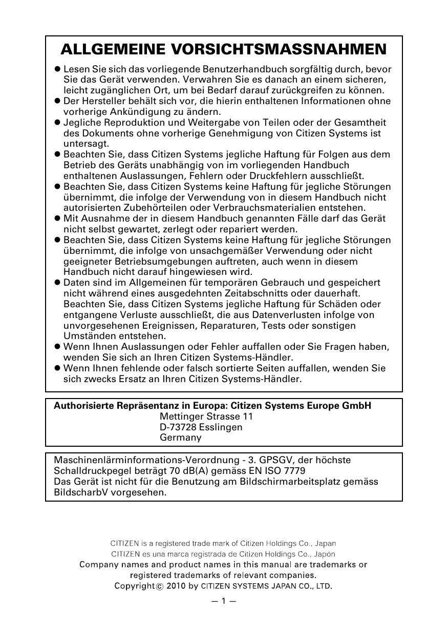 ALLGEMEINE VORSICHTSMASSNAHMEN e Lesen Sie sich das vorliegende Benutzerhandbuch sorgfältig durch, bevor Sie das Gerät verwenden. Verwahren Sie es danach an einem sicheren, leicht zugänglichen Ort, um bei Bedarf darauf zurückgreifen zu kônnen. © Der Hersteller behält sich vor, die hierin enthaltenen Informationen ohne vorherige Ankündigung zu ändern. e Jegliche Reproduktion und Weitergabe von Teilen oder der Gesamtheit des Dokuments ohne vorherige Genehmigung von Citizen Systems ist untersagt. e Beachten Sie, dass Citizen Systems jegliche Haftung für Folgen aus dem Betrieb des Geräts unabhängig von im vorliegenden Handbuch enthaltenen Auslassungen, Fehlern oder Druckfehlern ausschliefit. e Beachten Sie, dass Citizen Systems keine Haftung für jegliche Strungen übernimmi, die infolge der Verwendung von in diesem Handbuch nicht autorisierten Zubehôrteilen oder Verbrauchsmaterialien entstehen. e Mit Ausnahme der in diesem Handbuch genannten Fälle darf das Gerät nicht selbst gewartet, zerlegt oder repariert werden. e Beachten Sie, dass Citizen Systems keine Haftung für jegliche Strungen übernimmi, die infolge von unsachgemäfer Verwendung oder nicht geeigneter Betriebsumgebungen auftreten, auch wenn in diesem Handbuch nicht darauf hingewiesen wird. e Daten sind im Allgemeinen für temporären Gebrauch und gespeichert nicht während eines ausgedehnten Zeitabschnitts oder dauerhaft. Beachten Sie, dass Citizen Systems jegliche Haftung für Schäden oder entgangene Verluste ausschlieRt, die aus Datenverlusten infolge von unvorgesehenen Ereignissen, Reparaturen, Tests oder sonstigen Umständen entstehen. © Wenn lhnen Auslassungen oder Fehler auffallen oder Sie Fragen haben, wenden Sie sich an Ihren Citizen Systems-Händler. © Wenn lhnen fehlende oder falsch sortierte Seiten auffallen, wenden Sie sich zwecks Ersatz an Ihren Citizen Systems-Händler. Authorisierte Repräsentanz in Europa: Citizen Systems Europe GmbH Mettinger Strasse 11 D-73728 Esslingen Germany Maschinenlärminformations-Verordnung - 3. GPSGV, der hôchste Schalldruckpegel beträgt 70 dB(A) gemäss EN ISO 7779 Das Gerät ist nicht für die Benutzung am Bildschirmarbeitsplatz gemäss BildscharbV vorgesehen. CITIZEN is a registered trade mark of Citizen Holdings Co., Japan CITIZEN es una marca registrada de Citizen Holdings Co., Japôn Company names and product names in this manual are trademarks or registered trademarks of relevant companies. Copyright© 2010 by CITIZEN SYSTEMS JAPAN CO. LTD.