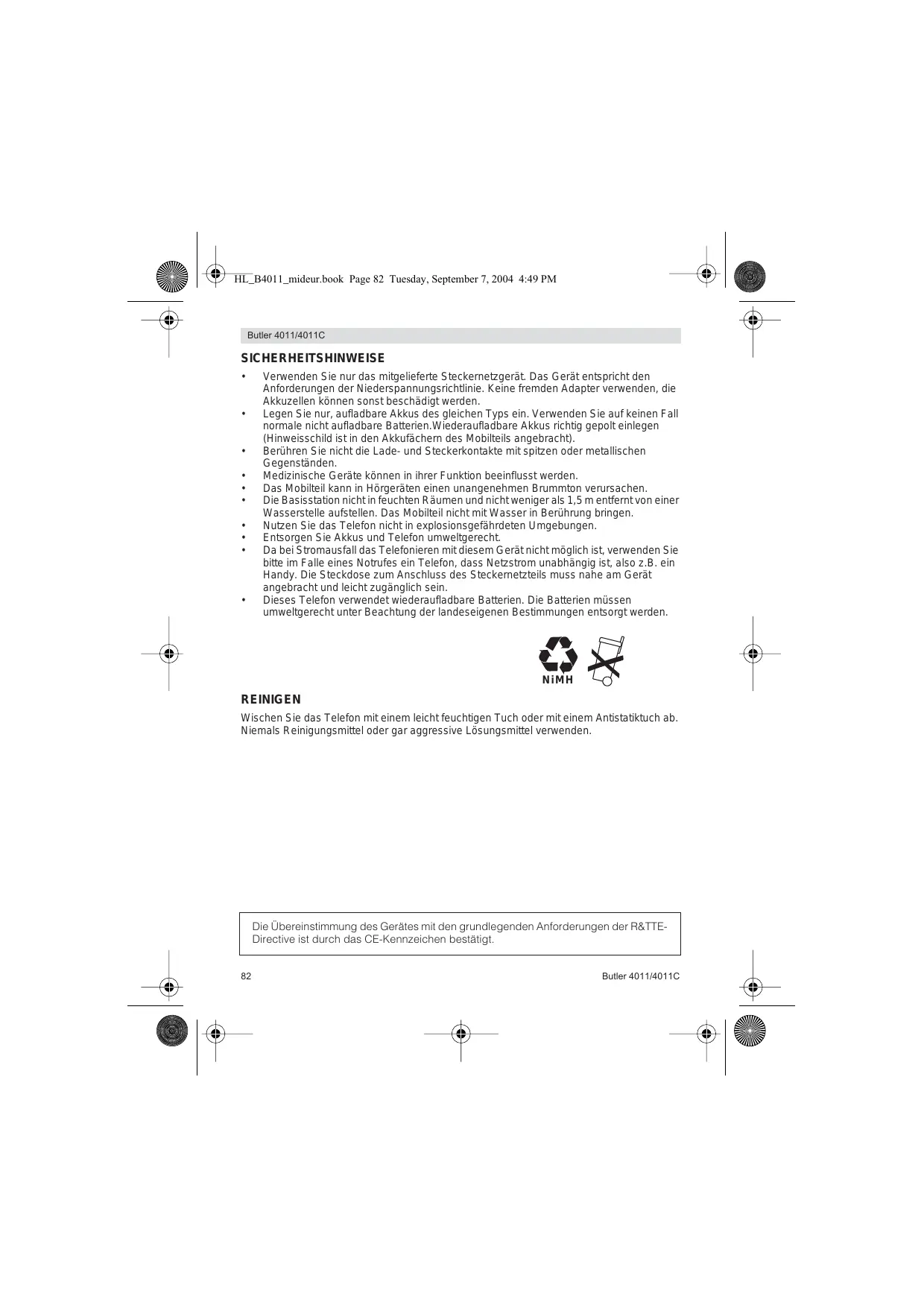 Verwenden Sie nur das mitgelieferte Steckernetzgerät. Das Gerät entspricht den Anforderungen der Niederspannungsrichtlinie. Keine fremden Adapter verwenden, die Akkuzellen können sonst beschädigt werden. Legen Sie nur, aufladbare Akkus des gleichen Typs ein. Verwenden Sie auf keinen Fall normale nicht aufladbare Batterien.Wiederaufladbare Akkus richtig gepolt einlegen (Hinweisschild ist in den Akkufächern des Mobilteils angebracht). Berühren Sie nicht die Lade- und Steckerkontakte mit spitzen oder metallischen Gegenständen. Medizinische Geräte können in ihrer Funktion beeinflusst werden. Das Mobilteil kann in Hörgeräten einen unangenehmen Brummton verursachen. Die Basisstation nicht in feuchten Räumen und nicht weniger als 1,5 m entfernt von einer Wasserstelle aufstellen. Das Mobilteil nicht mit Wasser in Berührung bringen. Nutzen Sie das Telefon nicht in explosionsgefährdeten Umgebungen. Entsorgen Sie Akkus und Telefon umweltgerecht. Da bei Stromausfall das Telefonieren mit diesem Gerät nicht möglich ist, verwenden Sie bitte im Falle eines Notrufes ein Telefon, dass Netzstrom unabhängig ist, also z.B. ein Handy. Die Steckdose zum Anschluss des Steckernetzteils muss nahe am Gerät angebracht und leicht zugänglich sein. Dieses Telefon verwendet wiederaufladbare Batterien. Die Batterien müssen umweltgerecht unter Beachtung der landeseigenen Bestimmungen entsorgt werden. N iMH REINIGEN Wischen Sie das Telefon mit einem leicht feuchtigen Tuch oder mit einem Antistatiktuch ab. Niemals Reinigungsmittel oder gar aggressive Lösungsmittel verwenden. Die Übereinstimmung des Gerätes mit den grundlegenden Anforderungen der R&TTEDirective ist durch das CE-Kennzeichen bestätigt.