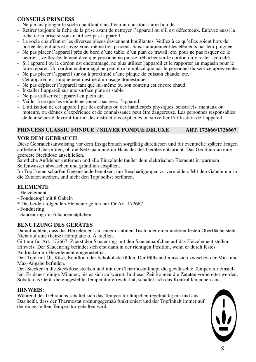 FONDUE-MÖGLICHKEITEN Dank des Temperaturreglers eignet sich der Fonduetopf hervorragend für verschiedene Fonduearten, beispielsweise für das klassische Fleischfondue, ein Käsefondue sowie ein Schokoladenfondue oder ein chinesisches Fondue (mit Bouillon). Den Topf mit den gewünschten Zutaten füllen und auf das Heizelement stellen. Den Topf mit Öl, Käse, Bouillon oder Schokolade füllen (nicht zu voll) und mit dem Thermostatknopf die gewünschte Temperatur einstellen. Während der Thermostat die Temperatur reguliert, schaltet sich das rote Lämpchen immer ein und aus. Für ein klassisches Fleischfondue den Thermostat auf die höchste Temperatur einstellen. Bei einer Fonduezubereitung mit Käse, Bouillon und Schokolade eine niedrigere Temperatur wählen. Die Temperatur so einstellen, dass der Topfinhalt nicht kocht. Insbesondere Käse und Schokolade sollten langsam erhitzt werden, um ein Überkochen zu vermeiden. Ab und zu umrühren, um eine glatte Mischung zu erhalten. Zum Lieferumfang des 172667 Silver Fondue Deluxe gehört ein Saucenring mit Saucennäpfchen. Das ist ideal, um zum Fondue verschiedene Saucen zu servieren. Die folgenden Öle eignen sich für die Fonduezubereitung: Maiskeimöl, Erdnussöl, Sonnenblumenöl und Frittieröl. Auf der Verpackung nachlesen, ob das jeweilige Öl für Fondues geeignet ist. Das ist wichtig, da einige Öle nicht geeignet sind und bei Gebrauch im Fondue spritzen können. Wenn das Heizelement nicht benutzt wird, den Stecker aus der Steckdose ziehen. REINIGUNG ZUERST DEN STECKER AUS DER STECKDOSE ZIEHEN UND ALLE ELEMENTE VOR DEM REINIGEN ABKÜHLEN LASSEN. DAS GERÄT VOLLSTÄNDIG ABKÜHLEN LASSEN, BEVOR ES UMGESTELLT WIRD. Abgesehen vom Heizelement können alle Bestandteile des Fonduetopfes in Seifenwasser oder im Geschirrspüler gereinigt werden. Keine scheuernden Reinigungsmittel oder –schwämme benutzen. Reinigungstipp: Eine Tasse Wasser und etwas Geschirrspülmittel in den Topf geben. Die niedrigste Temperatur einstellen und den Topf ungefähr zehn Minuten eingeschaltet lassen. Anschließend ausschalten und gut ausspülen. Das Heizelement muss trocken bleiben. Gegebenenfalls mit einem feuchten Tuch reinigen. PRINCESS-TIPPS - Das Heizelement nie in Wasser oder andere Flüssigkeiten tauchen. - Vor der Reinigung oder bei Auftreten eines Defekts immer den Netzstecker ziehen. Wenn das Gerät nicht benutzt wird, immer den Stecker aus der Steckdose ziehen. - Das Heizelement und die anderen Geräteteile werden sehr heiß. Außerhalb der Reichweite von Kindern aufbewahren und selbst ebenfalls vorsichtig sein. Die Elemente nur mit dem Griff anfassen. - Das Gerät nie zu nahe an den Rand des Tisches, der Arbeitsplatte usw. stellen, so dass es nicht herunterfallen kann. Darauf achten, dass das Kabel nicht so hängt, dass man darüber stolpern kann oder darin hängen bleibt. - Bei einer Beschädigung von Gerät oder Kabel das Gerät nicht mehr benutzen, sondern zur Reparatur zurück ins Geschäft bringen. Ein beschädigtes Kabel kann nur vom Kundendienst ausgetauscht werden. - Das Gerät niemals auf oder in unmittelbare Nähe einer heißen Kochplatte oder anderer Wärmequellen stellen. - Das Gerät ist ausschließlich für den Haushaltsgebrauch bestimmt. - Das Gerät nicht umstellen, solange das Gerät oder der Inhalt noch heiß sind. - Den Topf immer auf eine stabile und gerade Oberfläche stellen. - Das Gerät nicht im Freien benutzen. - Darauf achten, dass Kinder nicht mit dem Gerät spielen. - Die Benutzung dieses Gerätes durch Kinder oder Personen mit eingeschränkten körperlichen, sensorischen oder geistigen Fähigkeiten oder fehlender Erfahrung und Kenntnis kann Gefahren mit sich bringen. Diese Benutzer sind daher von den für ihre Sicherheit verantwortlichen Personen in den Gebrauch einzuweisen oder dürfen dieses Gerät nur unter Aufsicht benutzen. PRINCESS CLASSIC FONDUE / SILVER FONDUE DELUXE ART. 172666/1726667