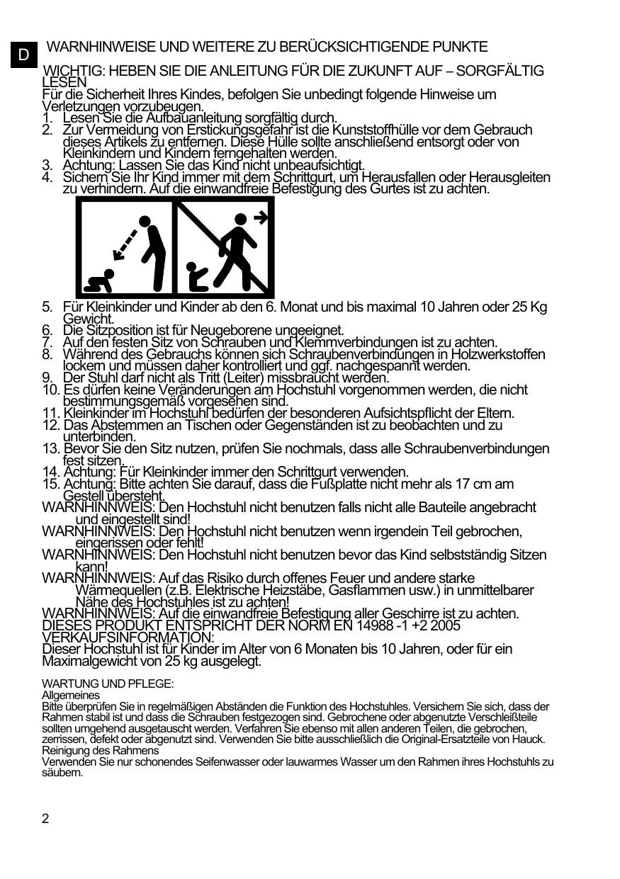 Gestell übersteht. WARNHINNWEIS: Den Hochstuhl nicht benutzen falls nicht alle Bauteile angebracht und eingestellt sind! WARNHINNWEIS: Den Hochstuhl nicht benutzen wenn irgendein Teil gebrochen, eingerissen oder fehlt! WARNHINNWEIS: Den Hochstuhl nicht benutzen bevor das Kind selbstständig Sitzen kann! WARNHINNWEIS: Auf das Risiko durch offenes Feuer und andere starke Wärmequellen (z.B. Elektrische Heizstäbe, Gasflammen usw.) in unmittelbarer Nähe des Hochstuhles ist zu achten! WARNHINNWEIS: Auf die einwandfreie Befestigung aller Geschirre ist zu achten. DIESES PRODUKT ENTSPRICHT DER NORM EN 14988 -1 +2 2005 VERKAUFSINFORMATION: Dieser Hochstuhl ist für Kinder im Alter von 6 Monaten bis 10 Jahren, oder für ein Maximalgewicht von 25 kg ausgelegt. WARTUNG UND PFLEGE: Allgemeines Bitte überprüfen Sie in regelmäßigen Abständen die Funktion des Hochstuhles. Versichern Sie sich, dass der Rahmen stabil ist und dass die Schrauben festgezogen sind. Gebrochene oder abgenutzte Verschleißteile sollten umgehend ausgetauscht werden. Verfahren Sie ebenso mit allen anderen Teilen, die gebrochen, zerrissen, defekt oder abgenutzt sind. Verwenden Sie bitte ausschließlich die Original-Ersatzteile von Hauck. Reinigung des Rahmens Verwenden Sie nur schonendes Seifenwasser oder lauwarmes Wasser um den Rahmen ihres Hochstuhls zu säubern.