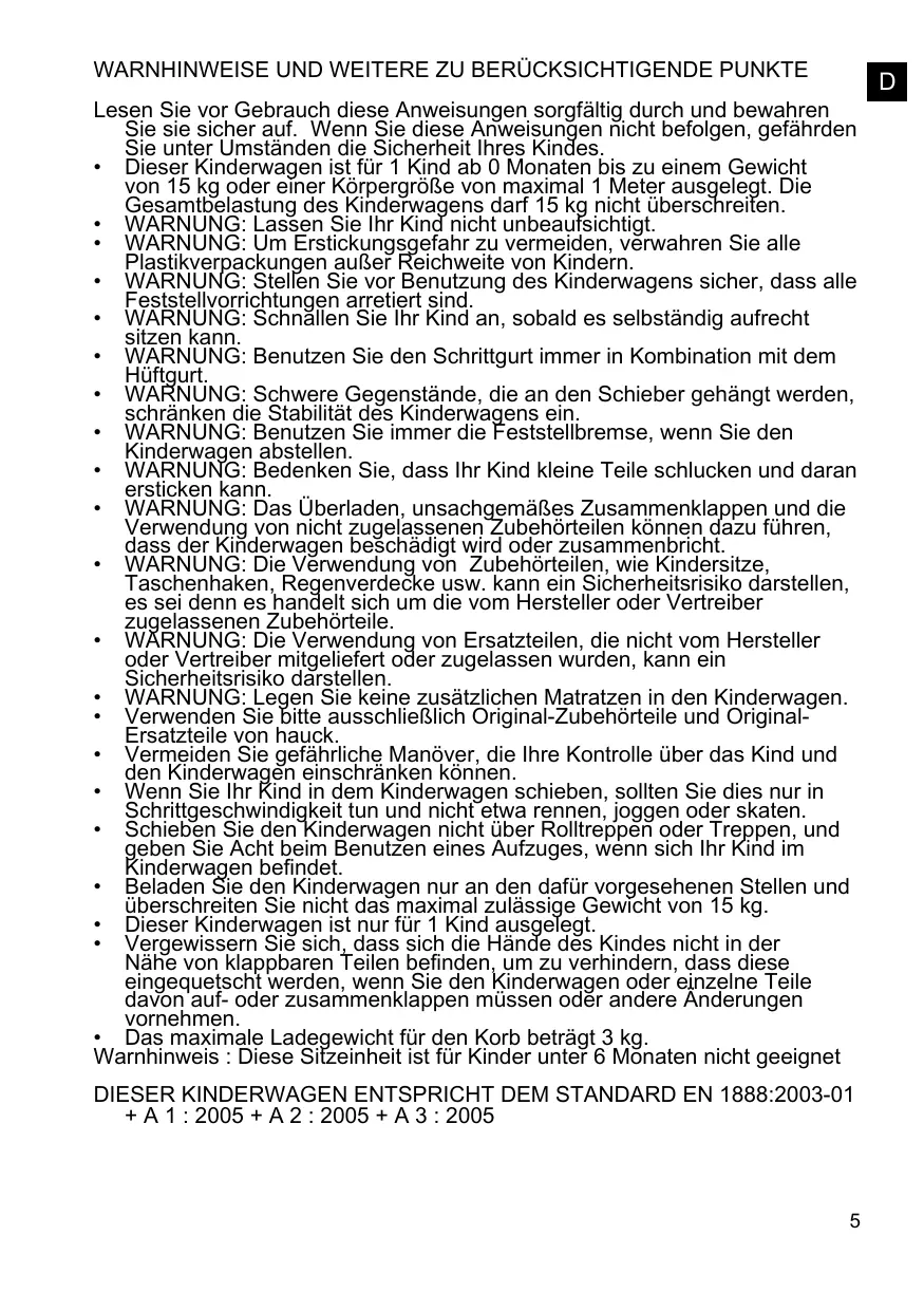 WARNHINWEISE UND WEITERE ZU BERÜCKSICHTIGENDE PUNKTE Lesen Sie vor Gebrauch diese Anweisungen sorgfältig durch und bewahren Sie sie sicher auf. Wenn Sie diese Anweisungen nicht befolgen, gefährden Sie unter Umständen die Sicherheit Ihres Kindes. • Dieser Kinderwagen ist für 1 Kind ab 0 Monaten bis zu einem Gewicht von 15 kg oder einer Körpergröße von maximal 1 Meter ausgelegt. Die Gesamtbelastung des Kinderwagens darf 15 kg nicht überschreiten. • WARNUNG: Lassen Sie Ihr Kind nicht unbeaufsichtigt. • WARNUNG: Um Erstickungsgefahr zu vermeiden, verwahren Sie alle Plastikverpackungen außer Reichweite von Kindern. • WARNUNG: Stellen Sie vor Benutzung des Kinderwagens sicher, dass alle Feststellvorrichtungen arretiert sind. • WARNUNG: Schnallen Sie Ihr Kind an, sobald es selbständig aufrecht sitzen kann. • WARNUNG: Benutzen Sie den Schrittgurt immer in Kombination mit dem Hüftgurt. • WARNUNG: Schwere Gegenstände, die an den Schieber gehängt werden, schränken die Stabilität des Kinderwagens ein. • WARNUNG: Benutzen Sie immer die Feststellbremse, wenn Sie den Kinderwagen abstellen. • WARNUNG: Bedenken Sie, dass Ihr Kind kleine Teile schlucken und daran ersticken kann. • WARNUNG: Das Überladen, unsachgemäßes Zusammenklappen und die Verwendung von nicht zugelassenen Zubehörteilen können dazu führen, dass der Kinderwagen beschädigt wird oder zusammenbricht. • WARNUNG: Die Verwendung von Zubehörteilen, wie Kindersitze, Taschenhaken, Regenverdecke usw. kann ein Sicherheitsrisiko darstellen, es sei denn es handelt sich um die vom Hersteller oder Vertreiber zugelassenen Zubehörteile. • WARNUNG: Die Verwendung von Ersatzteilen, die nicht vom Hersteller oder Vertreiber mitgeliefert oder zugelassen wurden, kann ein Sicherheitsrisiko darstellen. • WARNUNG: Legen Sie keine zusätzlichen Matratzen in den Kinderwagen. • Verwenden Sie bitte ausschließlich Original-Zubehörteile und OriginalErsatzteile von hauck. • Vermeiden Sie gefährliche Manöver, die Ihre Kontrolle über das Kind und den Kinderwagen einschränken können. • Wenn Sie Ihr Kind in dem Kinderwagen schieben, sollten Sie dies nur in Schrittgeschwindigkeit tun und nicht etwa rennen, joggen oder skaten. • Schieben Sie den Kinderwagen nicht über Rolltreppen oder Treppen, und geben Sie Acht beim Benutzen eines Aufzuges, wenn sich Ihr Kind im Kinderwagen befindet. • Beladen Sie den Kinderwagen nur an den dafür vorgesehenen Stellen und überschreiten Sie nicht das maximal zulässige Gewicht von 15 kg. • Dieser Kinderwagen ist nur für 1 Kind ausgelegt. • Vergewissern Sie sich, dass sich die Hände des Kindes nicht in der Nähe von klappbaren Teilen befinden, um zu verhindern, dass diese eingequetscht werden, wenn Sie den Kinderwagen oder einzelne Teile davon auf- oder zusammenklappen müssen oder andere Änderungen vornehmen. • Das maximale Ladegewicht für den Korb beträgt 3 kg. Warnhinweis : Diese Sitzeinheit ist für Kinder unter 6 Monaten nicht geeignet DIESER KINDERWAGEN ENTSPRICHT DEM STANDARD EN 1888:2003-01 + A 1 : 2005 + A 2 : 2005 + A 3 : 2005