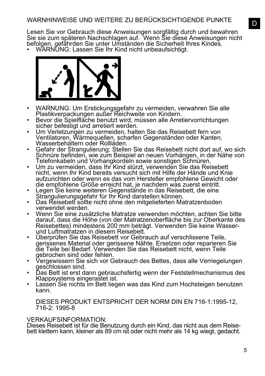 • Risque d‘étranglement : ne mettez jamais le lit d‘appoint en place près de cordons, par exemple ceux de nouveaux rideaux, ou à proximité de câbles téléphoniques et de cordons de rideaux ou de fils ou ficelles de tout genre. Evitez les risques de chute de votre enfant en renonçant à l‘emploi du lit d‘appoint dès que votre enfant tente de se mettre debout à l‘aide des mains et des genoux ou dès que son poids ou sa taille dépasse le poids ou la taille recommandé par le fabricant, selon le cas se présentant en premier. Ne posez jamais des objets qui seraient susceptibles de présenter un risque d‘étranglement pour votre enfant dans le lit d‘appoint. L‘emploi du lit d‘appoint n‘est pas recommandé sans son matelas de fond fourni. Si vous voulez utiliser un matelas supplémentaire, veillez à ce que la hauteur (du dessus du matelas jusqu‘au bord supérieur du lit d‘appoint) comporte au moins 200 mm. Ne vous servez pas de matelas à eau et de matelas gonflables dans ce lit d‘appoint. Assurez-vous que le lit d‘appoint est dénué de pièces usées, de matériaux déchirés ou de coutures défaites avant de vous en servir. Remplacez ou réparez les pièces, le cas échéant. Renoncez au lit d‘appoint en présence de pièces brisées ou manquantes ! Assurez-vous que tous les blocages du lit sont bien verrouillés avant emploi. Le lit est uniquement près à l‘emploi si le mécanisme de blocage du système de pliage est correctement enclenché. Ne laissez rien dans le lit que l‘enfant pourrait utiliser pour l‘escalader. CE PRODUIT EST CONFORME A LA NORME DIN EN 716-1:1995-12, 716-2: 1995-8