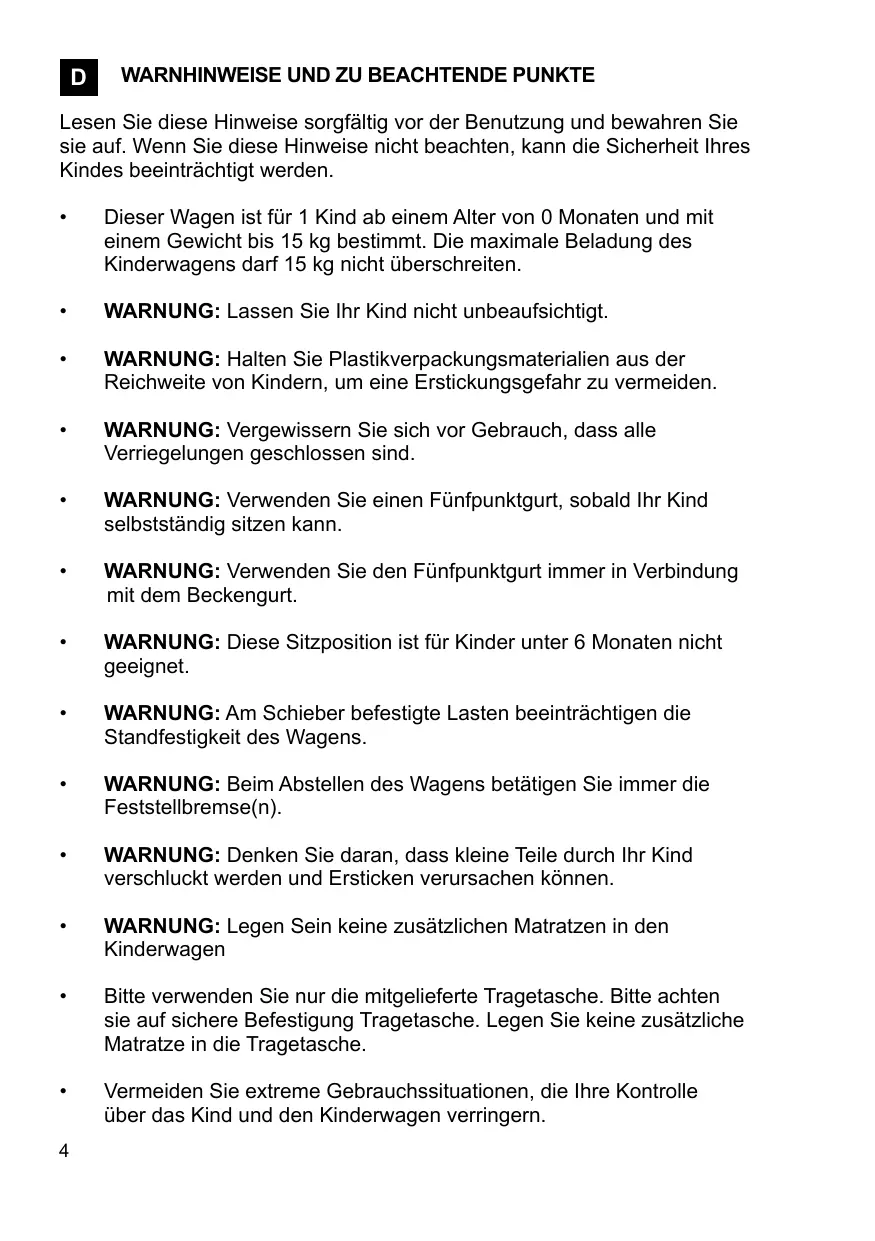 Dieser Wagen ist für 1 Kind ab einem Alter von 0 Monaten und mit einem Gewicht bis 15 kg bestimmt. Die maximale Beladung des Kinderwagens darf 15 kg nicht überschreiten.
