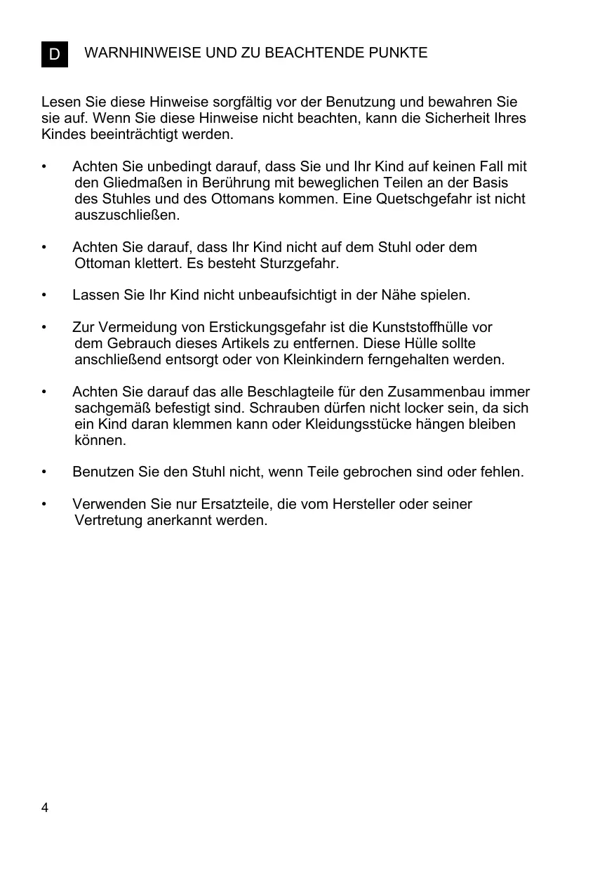 Veillez impérativement à ce que vos membres ou ceux de votre enfant n’entrent en aucun cas en contact avec les pièces mobiles à la base de la chaise et de l’ottoman. Le risque de se coincer n’est pas exclu.