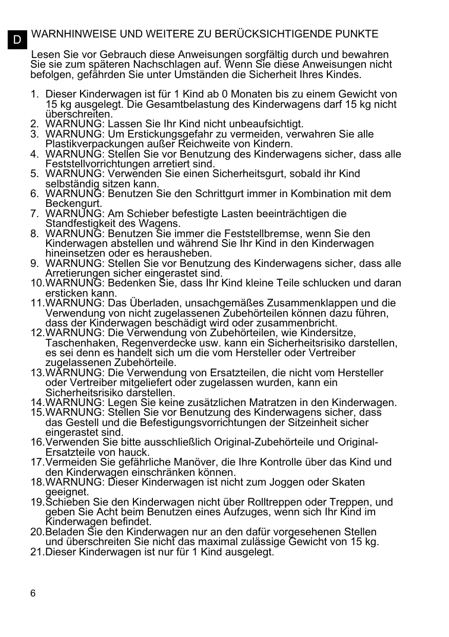 1. Cette poussette est conçue pour un enfant à partir de 0 mois et jusqu‘à un poids de 15 kg. La charge maximale de la poussette ne doit pas dépasser 15 kg. 2. AVERTISSEMENT : Ne laissez jamais votre enfant sans surveillance. 3. AVERTISSEMENT : conservez tous les conditionnements en plastique hors de portée des enfants en prévention de tout danger d‘asphyxie. 4. AVERTISSEMENT : assurez-vous que tous les dispositifs d‘arrêt de la poussette ont été correctement bloqués avant de vous en servir. 5. AVERTISSEMENT : servez-vous d‘un harnais de sécurité dès que votre enfant peut se tenir assis tout seul. 6. AVERTISSEMENT : servez-vous toujours de la ceinture entre les jambes en combinaison avec la ceinture pour la hanche. 7. AVERTISSEMENT : les charges suspendues au guidon ou aux cannes influencent la stabilité de la poussette. 8. AVERTISSEMENT : utilisez toujours le frein d‘arrêt lorsque vous immobilisez la poussette et chaque fois que vous placez l‘enfant dans la poussette ou que vous le retirez. 9. AVERTISSEMENT : assurez-vous que tous les dispositifs d‘arrêt de la poussette ont été correctement enclenchés avant de vous en servir. 10.AVERTISSEMENT : n‘oubliez jamais que votre enfant pourrait avaler les petites pièces et s‘asphyxier. 11.AVERTISSEMENT : les surcharges, un repliage non conforme à l‘usage prévu et l‘emploi d‘accessoires non homologués peuvent endommager la poussette ou provoquer son effondrement. 12.AVERTISSEMENT : l‘emploi d‘accessoires, tels les sièges pour enfant, crochets pour sacs, capots protège-pluie etc. est susceptible de présenter un risque, sauf s‘il s‘agit d‘accessoires homologués par le fabricant ou le distributeur. 13.AVERTISSEMENT : l‘emploi de pièces de rechange non fournies ou homologuées par le fabricant ou le distributeur peut présenter un risque pour la sécurité. 14.AVERTISSEMENT : ne posez jamais de matelas supplémentaires dans la poussette. 15.AVERTISSEMENT : veillez, avant de vous servir de la poussette, à ce que le bâti et les dispositifs de fixation de l‘assise soient correctement enclenchés. 16.Utilisez exclusivement des accessoires d‘origine et des pièces de rechange d‘origine de la maison hauck. 17.Evitez toutes les situations d‘emploi extrêmes, qui risquent de réduire votre contrôle sur l’enfant et la poussette. 18.AVERTISSEMENT : cette poussette n‘est pas appropriée à la pratique du jogging ou de patins en ligne. 19.Ne vous servez pas de la poussette sur des escaliers roulants ou des escaliers en général et soyez prudent dans les ascenseurs tant que votre enfant occupe la poussette. 17