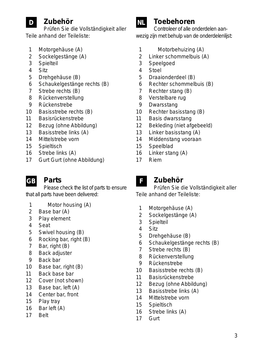 Motorgehäuse (A) Sockelgestänge (A) Spielteil Sitz Drehgehäuse (B) Schaukelgestänge rechts (B) Strebe rechts (B) Rückenverstellung Rückenstrebe Basisstrebe rechts (B) Basisrückenstrebe Bezug (ohne Abbildung) Basisstrebe links (A) Mittelstrebe vorn Spieltisch Strebe links (A) Gurt 3
