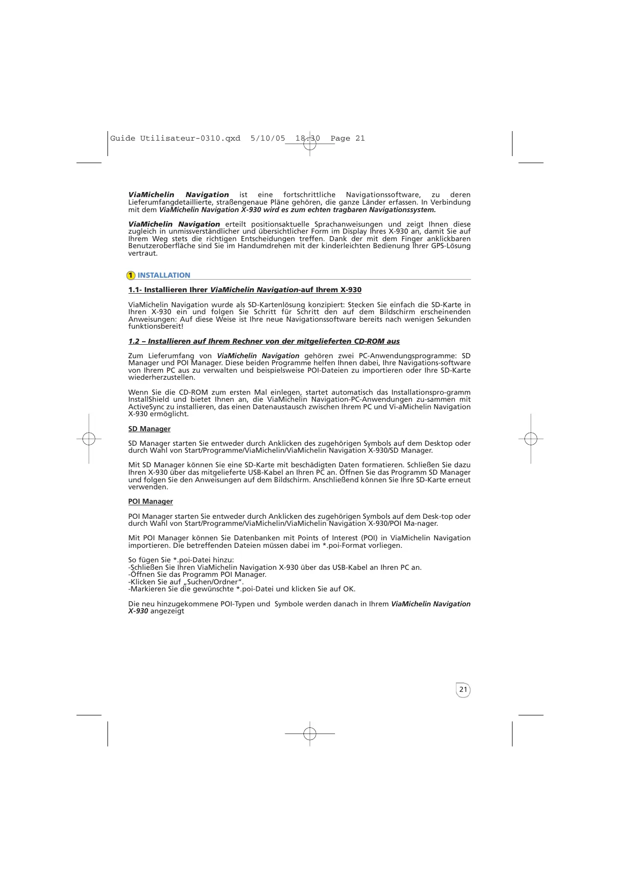 Guide Utilisateur-0310.qxd 5/10/05 18:30 Page 21 ViaMichelin Navigation ist eine fortschrittliche Navigationssoftware, zu deren Lieferumfangdetaillierte, straßengenaue Pläne gehören, die ganze Länder erfassen. In Verbindung mit dem ViaMichelin Navigation X-930 wird es zum echten tragbaren Navigationssystem. ViaMichelin Navigation erteilt positionsaktuelle Sprachanweisungen und zeigt Ihnen diese zugleich in unmissverständlicher und übersichtlicher Form im Display Ihres X-930 an, damit Sie auf Ihrem Weg stets die richtigen Entscheidungen treffen. Dank der mit dem Finger anklickbaren Benutzeroberfläche sind Sie im Handumdrehen mit der kinderleichten Bedienung Ihrer GPS-Lösung vertraut. 1 INSTALLATION 1.1- Installieren Ihrer ViaMichelin Navigation-auf Ihrem X-930 ViaMichelin Navigation wurde als SD-Kartenlösung konzipiert: Stecken Sie einfach die SD-Karte in Ihren X-930 ein und folgen Sie Schritt für Schritt den auf dem Bildschirm erscheinenden Anweisungen: Auf diese Weise ist Ihre neue Navigationssoftware bereits nach wenigen Sekunden funktionsbereit!