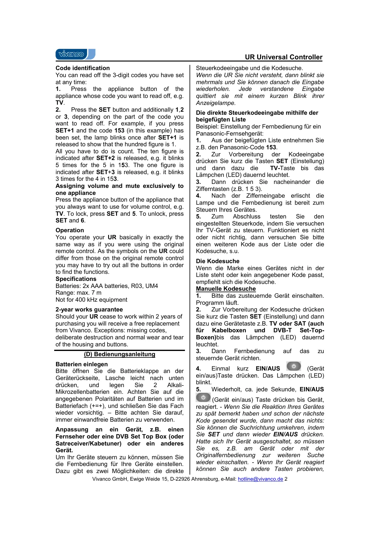Vivanco GmbH, Ewige Weide 15, D-22926 Ahrensburg, e-Mail: hotline@vivanco.de 2