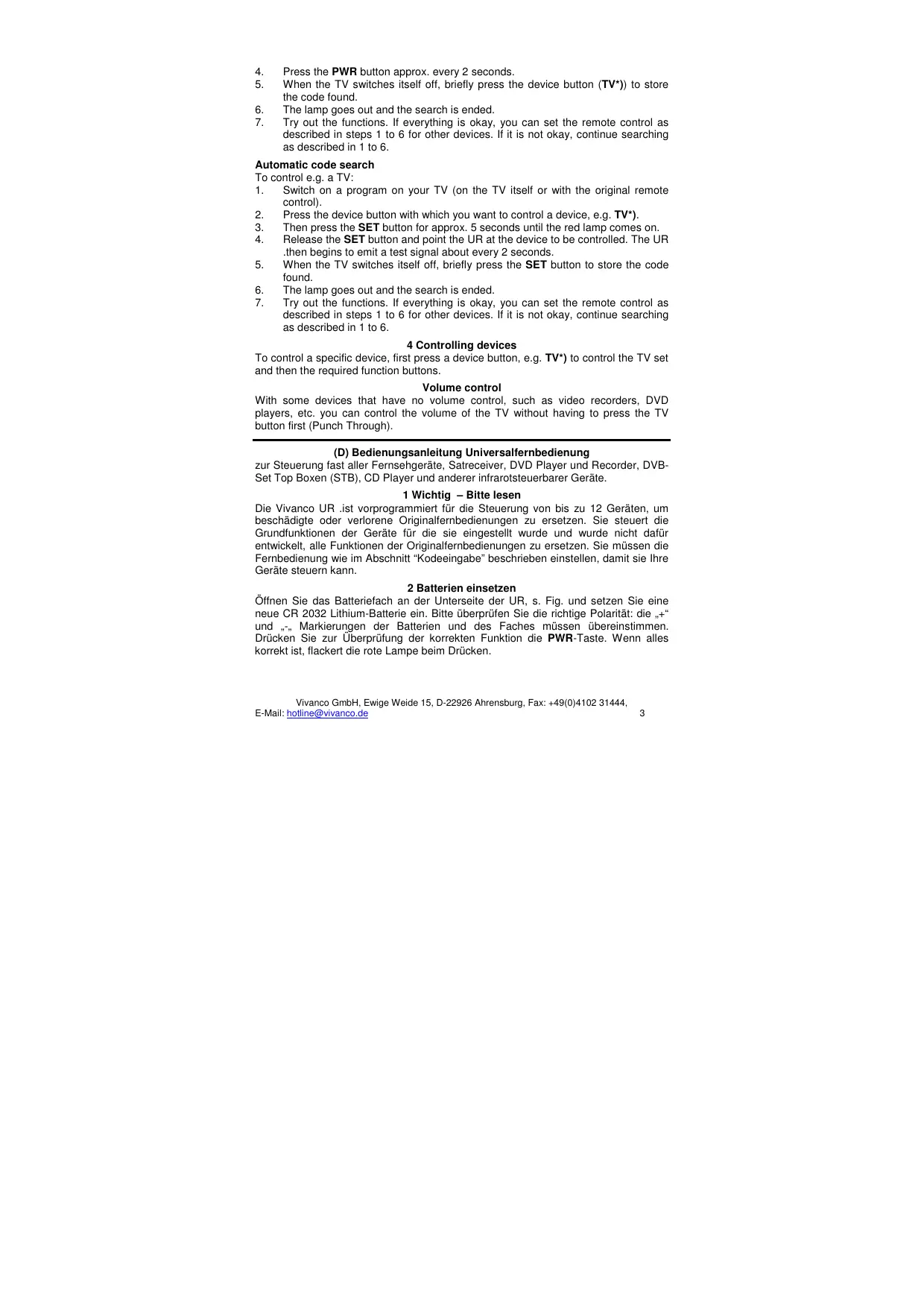 Vivanco GmbH, Ewige Weide 15, D-22926 Ahrensburg, Fax: +49(0)4102 31444,