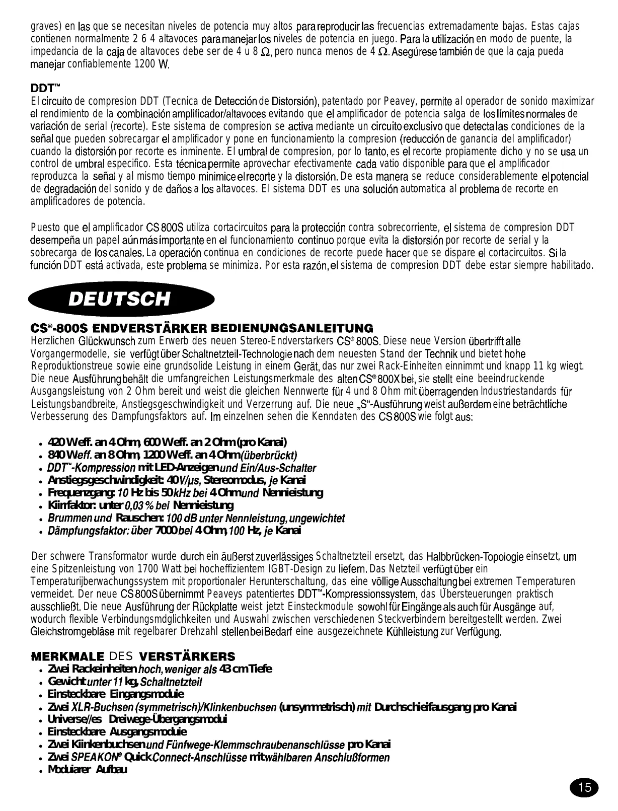 Herzlichen Glückwunsch zum Erwerb des neuen Stereo-E ndverstarkers CS° 800$. Diese neue Version übertrifft alle Vorgangermodelle, sie verfügtüber Schaltnetzteil-Technologienach dem neuesten Stand der Technik und bietet hohe Reproduktionstreue sowie eine grundsolide Leistung in einem Gerät, das nur zwei Rack-Einheiten einnimmt und knapp 11 kg wiegt. Die neue Austührungbehält die umfangreichen Leistungsmerkmale des alten CS°800X bei, sie stellt eine beeindruckende Ausgangsleistung von 2 Ohm bereit und weist die gleichen Nennwerte für 4 und 8 Ohm mit überragenden Industriestandards für Leistungsbandbreite, Anstiegsgeschwindigkeit und Verzerrung auf. Die neue ,S“-Ausführung weist auBerdem eine beträchtliche Verbesserung des Dampfungsfaktors auf. Im einzelnen sehen die Kenndaten des CS 8008 wie folgt aus: . 20 Wef. an 40hm 600 Weff. an 2 Ohm (pro Karki) + 80 Weff. an 8 Ohm 1200 Weff. an 40hm/überbrückt) .< DDT"-Kompression mitLED-Arzeigenund Ein/Aus-Schalter - Arstiegsgeschmindigkeit 40//us, Stereomods, je Kanei . Frequerzoeng 10 Hz bis 50kHz bei 4Ohmund Nennieistung .< Kinfekior: unter 0,03 % bei Nennieistung . Brummenund Rauscherr 100 dB unter Nennleistung, ungewichtet + Dämpfungsfaktor: über 7000bei 4Ohm 100 H, je Karei Der schwere Transformator wurde durch ein äuBerst zuverlässiges Schaltnetzteil ersetzt, das Halbbrücken-Topologie einsetzt, um eine Spitzenleistung von 1700 Watt bei hocheffizientem IGBT-Design zu liefern. Das Netzteil verfügt über ein Temperaturiberwachungssystem mit proportionaler Herunterschaltung, das eine vêllige Ausschaltungbeï extremen Temperaturen vermeidet. Der neue CS 800$ übernimmt Peaveys patentiertes DDT”-Kompressionssystem, das Übersteuerungen praktisch ausschlieBt. Die neue Ausführung der Rückplatte weist jetzt Einsteckmodule sowohl für Eingänge als auch für Ausgänge auf, wodurch flexible Verbindungsmdglichkeiten und Auswahl zwischen verschiedenen Steckverbindern bereitgestellt werden. Zwei Gleichstromgebläse mit regelbarer Drehzahl stellenbeiBedarf eine ausgezeichnete Kühlleistung zur Verfügung.