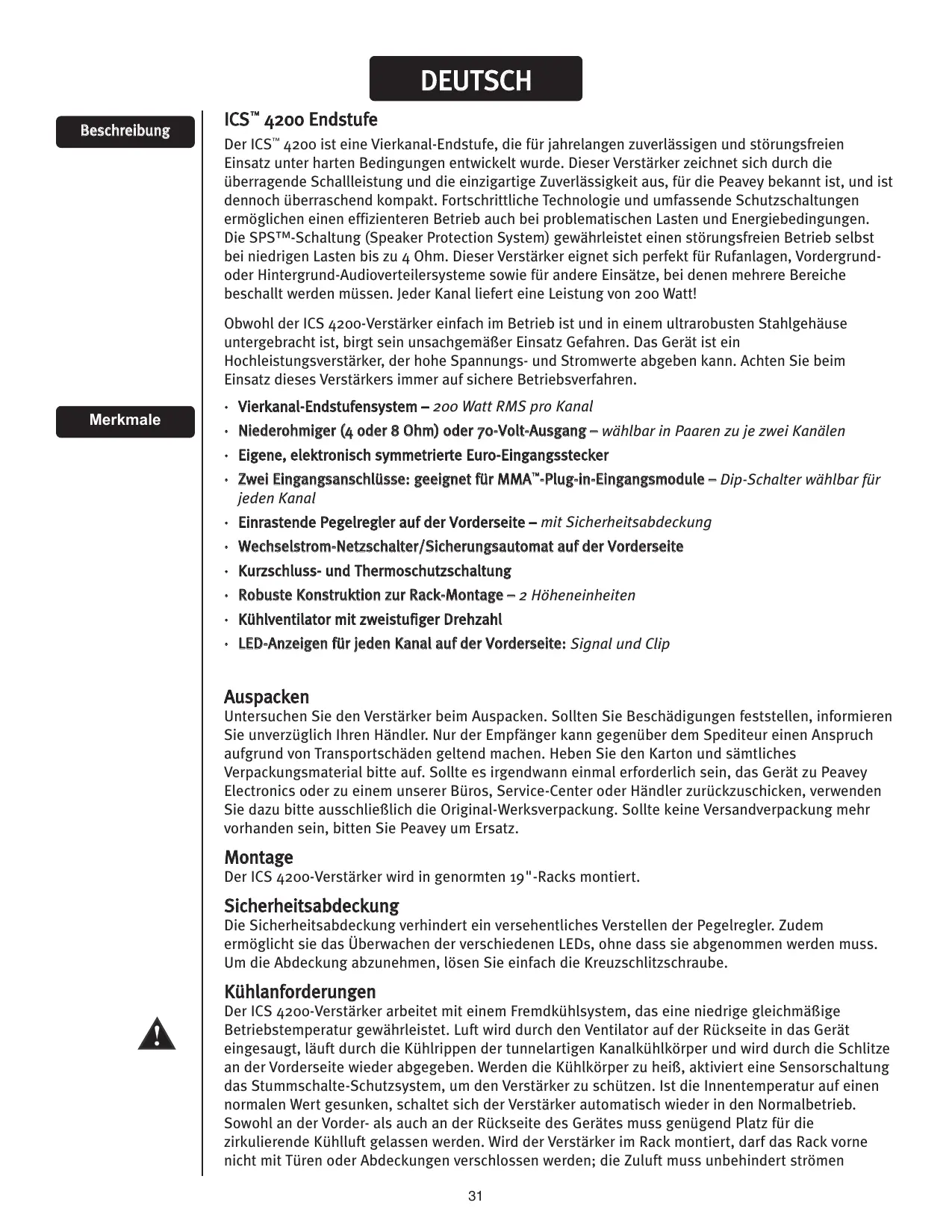 DEUTSCH Beschreibung ICS™ 4200 Endstufe Der ICS™ 4200 ist eine Vierkanal-Endstufe, die für jahrelangen zuverlässigen und störungsfreien Einsatz unter harten Bedingungen entwickelt wurde. Dieser Verstärker zeichnet sich durch die überragende Schallleistung und die einzigartige Zuverlässigkeit aus, für die Peavey bekannt ist, und ist dennoch überraschend kompakt. Fortschrittliche Technologie und umfassende Schutzschaltungen ermöglichen einen effizienteren Betrieb auch bei problematischen Lasten und Energiebedingungen. Die SPS™-Schaltung (Speaker Protection System) gewährleistet einen störungsfreien Betrieb selbst bei niedrigen Lasten bis zu 4 Ohm. Dieser Verstärker eignet sich perfekt für Rufanlagen, Vordergrundoder Hintergrund-Audioverteilersysteme sowie für andere Einsätze, bei denen mehrere Bereiche beschallt werden müssen. Jeder Kanal liefert eine Leistung von 200 Watt! Obwohl der ICS 4200-Verstärker einfach im Betrieb ist und in einem ultrarobusten Stahlgehäuse untergebracht ist, birgt sein unsachgemäßer Einsatz Gefahren. Das Gerät ist ein Hochleistungsverstärker, der hohe Spannungs- und Stromwerte abgeben kann. Achten Sie beim Einsatz dieses Verstärkers immer auf sichere Betriebsverfahren. Merkmale