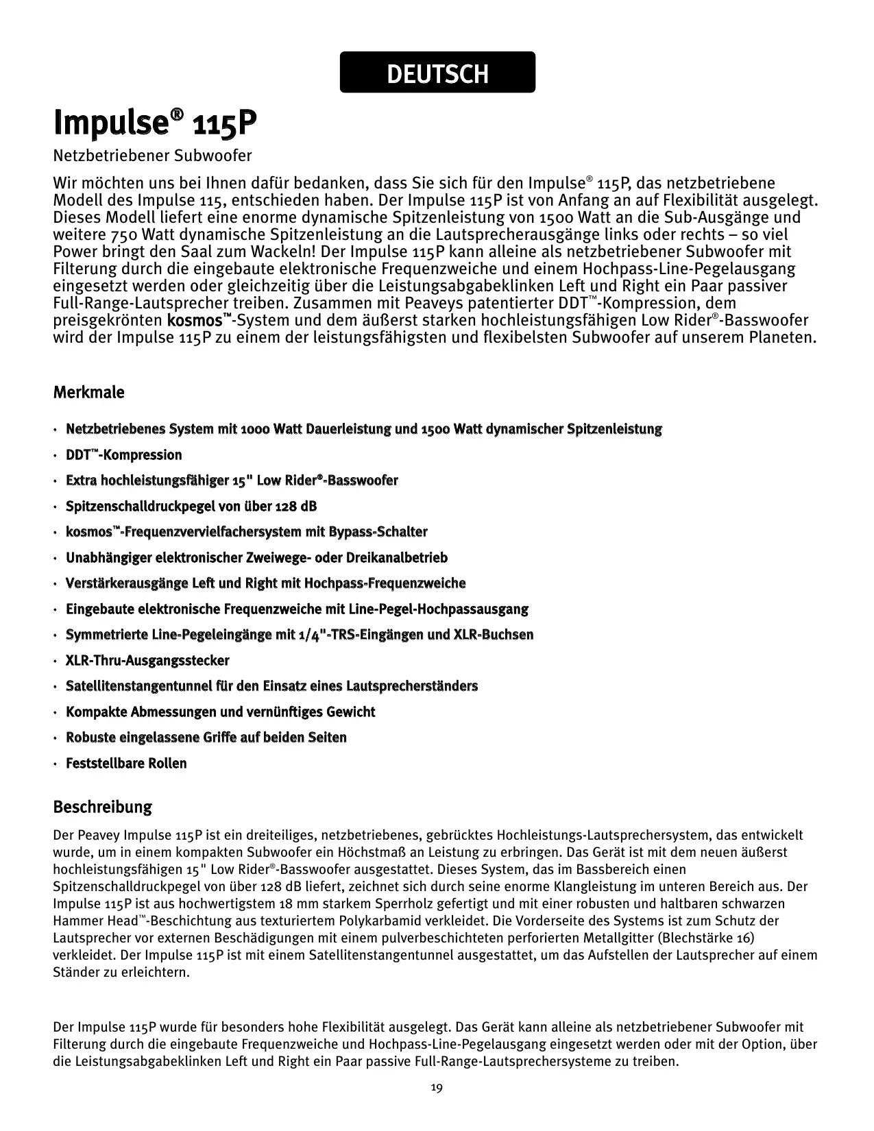 DDT Dynamic Range: Greater than 18 dB THD & IM: Typically less than 0.3% Damping Factor: Typically less than 100 @ 1000 Hz‚ 8 Ohms Power Requirements: 1300 W‚ 120 VAC‚ 60 Hz DEUTSCH Impulse® 115P Netzbetriebener Subwoofer Wir möchten uns bei Ihnen dafür bedanken, dass Sie sich für den Impulse® 115P, das netzbetriebene Modell des Impulse 115, entschieden haben. Der Impulse 115P ist von Anfang an auf Flexibilität ausgelegt. Dieses Modell liefert eine enorme dynamische Spitzenleistung von 1500 Watt an die Sub-Ausgänge und weitere 750 Watt dynamische Spitzenleistung an die Lautsprecherausgänge links oder rechts – so viel Power bringt den Saal zum Wackeln! Der Impulse 115P kann alleine als netzbetriebener Subwoofer mit Filterung durch die eingebaute elektronische Frequenzweiche und einem Hochpass-Line-Pegelausgang eingesetzt werden oder gleichzeitig über die Leistungsabgabeklinken Left und Right ein Paar passiver Full-Range-Lautsprecher treiben. Zusammen mit Peaveys patentierter DDT™-Kompression‚ dem preisgekrönten kosmos™-System und dem äußerst starken hochleistungsfähigen Low Rider®-Basswoofer wird der Impulse 115P zu einem der leistungsfähigsten und flexibelsten Subwoofer auf unserem Planeten. Merkmale