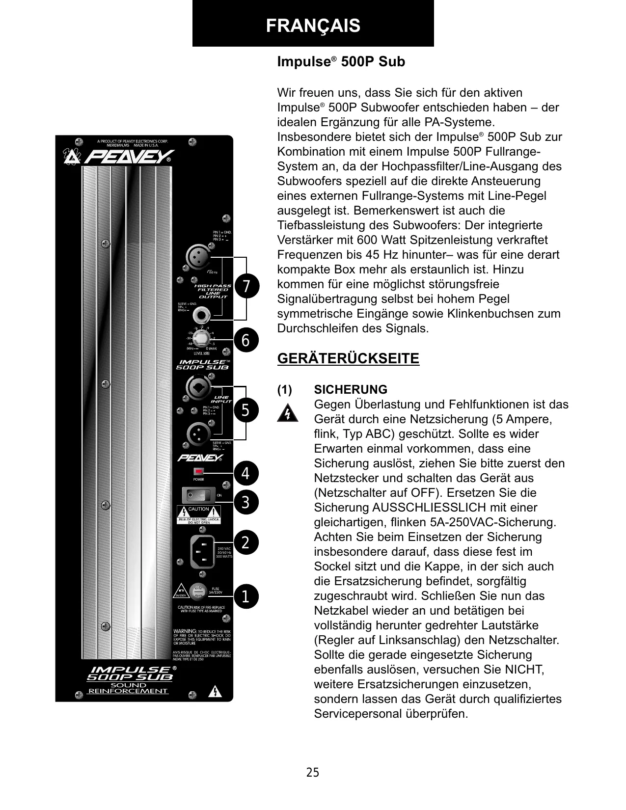 Hardware-Kontrolle Überprüfen Sie nach längeren Einsatzperioden regelmäkig die Hardware des Impulse 500P Subwoofers. Sitzen die rückwärtigen Schrauben sowie die Verbindungsschrauben zwischen Schallwand und Rückenteil noch fest? Aufgrund der in der Natur der Sache liegenden starken Vibrationen kann es vorkommen, dass sich Schrauben bei längerem Einsatz lôsen. BESCHREIBUNG Der Peavey Impulse 500P Subwoofer ist ein äuRerst kompakter, aktiver Basslautsprecher mit einem sehr hohen Leistungsvermôgen. Mit einem môüglichen Schalldruckpegel von über 124 dB Peak kann dieser Subwoofer enorme Bassreserven entwickeln. Für extreme Langlebigkeit bei elegantem Erscheinungsbild wurde das trapezfôrmige Gehäuse im Spritzgussverfahren aus extrem schlagfestem Polypropylen gefertigt und mit einem beschichteten Metallschutzgitter (Lochblech) versehen. Das aktive Subwoofer-System leistet bis zu 600 W Spitzenleistung und ist mit einem 15"- Black Widow®-Basslautsprecher (1568) mit Kevlar"-Membran ausgestattet. Die symmetrischen Eingänge des integrierten Preamps/EQs setzen sich aus einer 6,3-mm- Stereoklinkenbuchse (TRS), einmal XLR (male) und einer kombinierten XLR(female)/6,3-mm- Stereoklinkenbuchse zusammen, die alle parallel miteinander verschaltet sind. Der integrierte Leistungsverstärker sorgt für eine annähernd verzerrungsfreie Verstärkung mit 300 W RMS bei einer Nennimpedanz von 8 Ohm und wurde auf besondere Zuverlässigkeit und kräftige Basswiedergabe hin ausgewählt. Zusätzlich arbeitet der Verstärker auf Basis unserer patentierten DDT"-Kompressorschaltung, die ein hôrbares Übersteuern praktisch verhindert. Für problemlosen Transport und optimales Handling wurde das Gehäuse mit mehreren Griffmulden, Befestigungsmôglichkeiten (oben und unten) für das Peavey Versamount” 70- Fluggeschirr sowie einer Hochständer-Aufnahmemulde versehen.