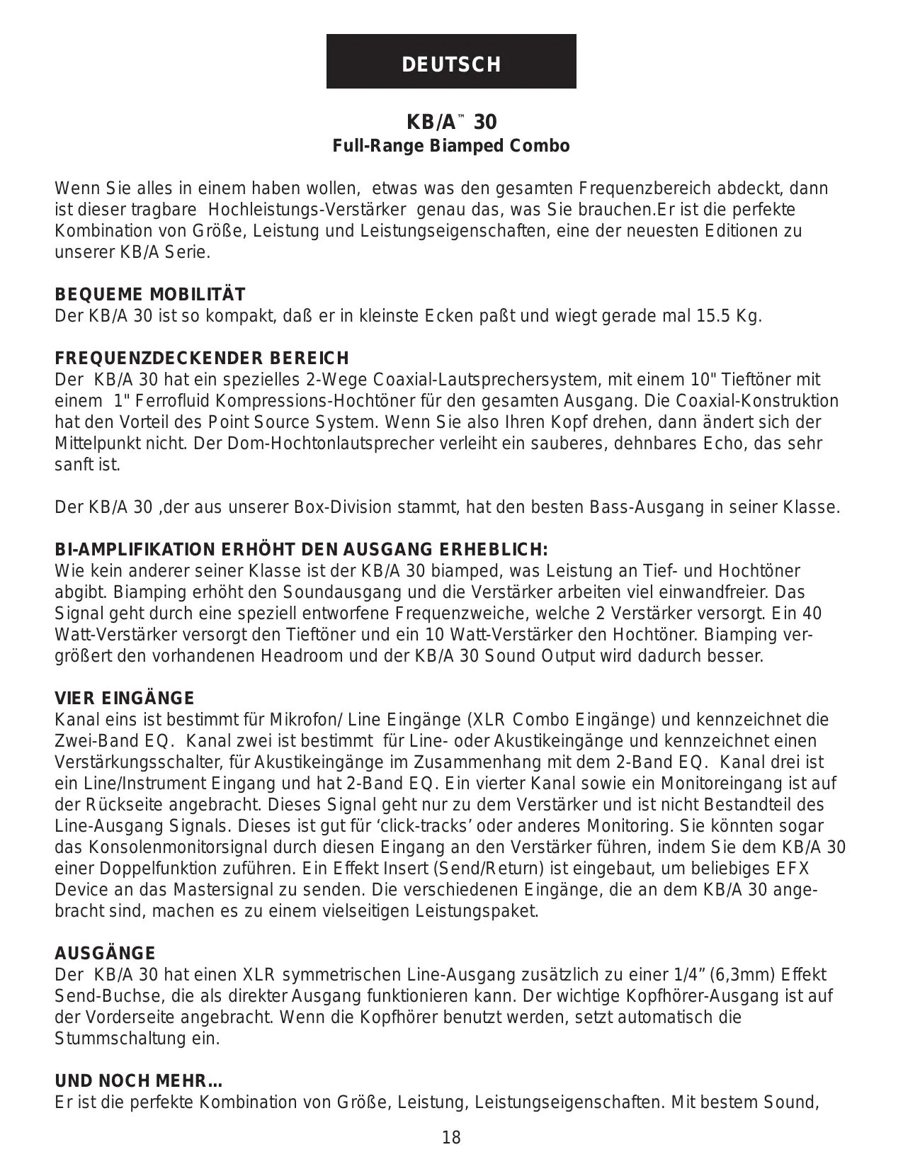 SALIDAS El biamplificador combinado KB/A 30 cuenta con una salida de línea balanceada XLR, además de un enchufe hembra de señal de muestra de efectos de 1/4 pulg., que también puede utilizarse para las salidas directas. La imprescindible salida para auriculares está situada en la parte frontal del biamplificador combinado, lo que permite acceder a ella con facilidad. La señal del amplificador se silencia automáticamente cuando se utilizan los auriculares. PLEIN REGISTRE Le KB/A 30 est ŽquipŽ dÕun haut-parleur spŽcial deux voies comprenant une membrane de 10" et un tweeter 1" ferro fluid pour une reproduction parfaite du son. Le design coaxial permet la diffusion du son depuis un point unique. Ainsi, lorsque vous tournez la t•te ou lorsque vous vous dŽplacez, la source du son reste fixe et inchangŽe. Le tweeter ˆ d™me assure une rŽponse parfaite de aigus. LÕenceinte accoustique du KB/A 30, rŽalisŽe par notre division ÒBassesÓ, se prŽsente sous la forme dÕune enceinte fermŽe et isolŽe procurant une rŽponse optimum dans les basses frŽquence. LA BIAMPLIFICATION AUGMENTE LE NIVEAU DE SORTIE EXPONENTIELLEMENT Le KB/A 30 est lÕun des seuls combos de sa classe ˆ •tre biamplifiŽ, chaque transducteur possŽdant son propre ampli de puissance. En faisant travailler les Žtages de puissance de mani•re plus efficace, le niveau de sortie gŽnŽrale est notablement augmentŽ. Le signal passe au travers dÕun filtre actif spŽcial alimentant les deux amplificateurs de puissance. LÕun de 40 Watt alimente le HP et lÕautre de 10 Watt se charge du tweeter. La biamplification augmente considŽrablement la plage dynamique du KB/A 30 et lui permet de sonner bien plus fort quÕon ne pourrait se lÕimaginer. QUATRE ENTRƒES Le canal 1 est optimisŽ pour les signaux micros et Ligne (entrŽe XLR combo) et poss•de un EQ 2 bandes. Le canal est destinŽ aux signaux Ligne et aux instruments accoustiques. Il poss•de un sŽlecteur de gain en plus de son EQ 2 bandes. Le canal 3 se charge des signaux line/instrument et est lui aussi ŽquipŽ dÕun EQ 2 bandes. Un quatri•me canal est situŽ ˆ lÕarri•re du combo et fournit une entrŽe Retour (Monitor). Son signal est directement injectŽ dans les amplis de puissance. Cette entrŽe est idŽale pour les clics ou toute autre application de retour (utilisation comme amplification + retour personnel pour le mix gŽnŽral). Un insert dÕeffets (send/return) est fournit pour vous permettre dÕajouter au signal master vos effets favoris. SORTIE Le KB/A 30 offre une sortie XLR symŽtrique de niveau ligne en plus dÕun Jack effects send pouvant fonctionner comme Direct Out. De plus, une sortie casque est disposŽe en fa•ade et coupe automatiquement le signal envoyŽ aux amplis de puissance lorsquÕelle est utilisŽe. Cette amplificateur reprŽsente la parfaite combinaison de taille, puissance et versatilitŽ. Avec un son excellent, un design fait pour la route et une fiabilitŽ exemplaire, le KB/A 30 est lÕamplification de choix pour votre clavier, votre guitare Žlectrique ou la voix.