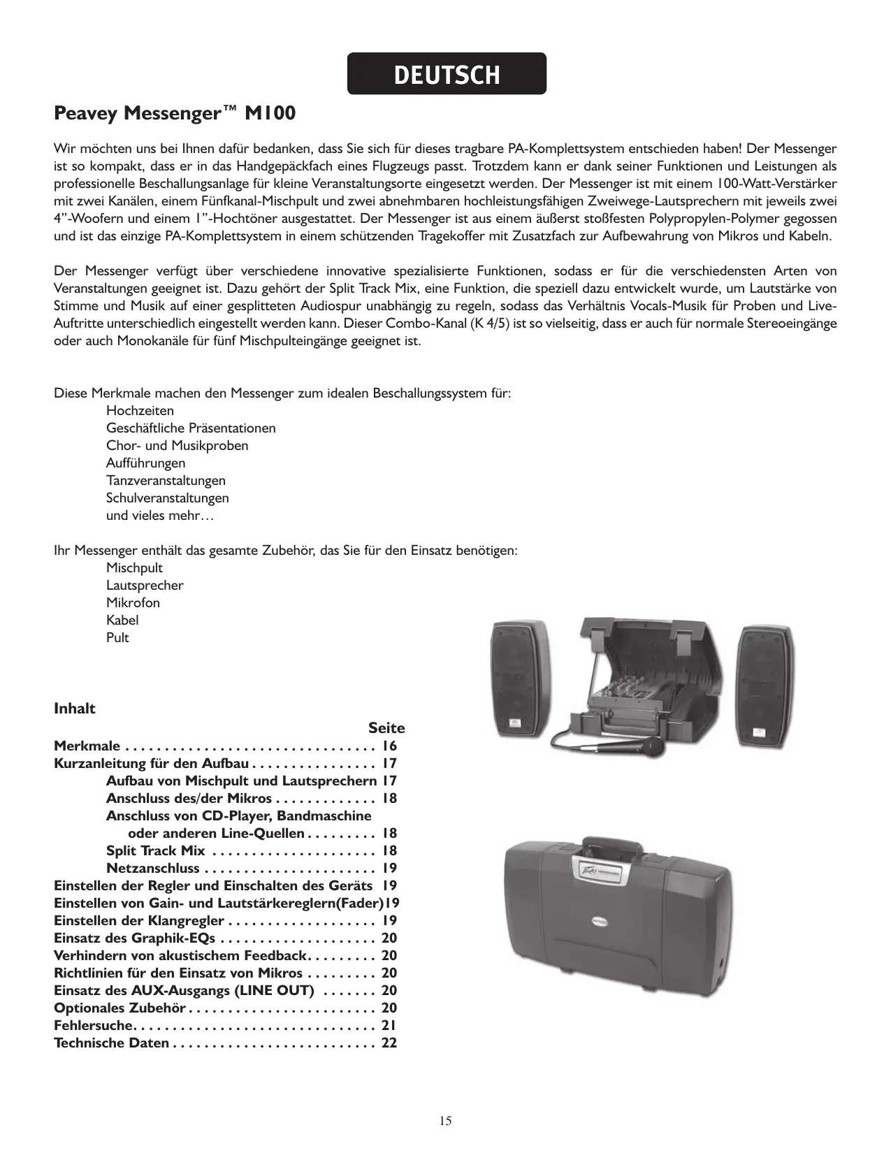 DEUTSCH Peavey Messenger™ M100 Wir möchten uns bei Ihnen dafür bedanken, dass Sie sich für dieses tragbare PA-Komplettsystem entschieden haben! Der Messenger ist so kompakt, dass er in das Handgepäckfach eines Flugzeugs passt. Trotzdem kann er dank seiner Funktionen und Leistungen als professionelle Beschallungsanlage für kleine Veranstaltungsorte eingesetzt werden. Der Messenger ist mit einem 100-Watt-Verstärker mit zwei Kanälen, einem Fünfkanal-Mischpult und zwei abnehmbaren hochleistungsfähigen Zweiwege-Lautsprechern mit jeweils zwei 4”-Woofern und einem 1”-Hochtöner ausgestattet. Der Messenger ist aus einem äußerst stoßfesten Polypropylen-Polymer gegossen und ist das einzige PA-Komplettsystem in einem schützenden Tragekoffer mit Zusatzfach zur Aufbewahrung von Mikros und Kabeln. Der Messenger verfügt über verschiedene innovative spezialisierte Funktionen, sodass er für die verschiedensten Arten von Veranstaltungen geeignet ist. Dazu gehört der Split Track Mix, eine Funktion, die speziell dazu entwickelt wurde, um Lautstärke von Stimme und Musik auf einer gesplitteten Audiospur unabhängig zu regeln, sodass das Verhältnis Vocals-Musik für Proben und LiveAuftritte unterschiedlich eingestellt werden kann. Dieser Combo-Kanal (K 4/5) ist so vielseitig, dass er auch für normale Stereoeingänge oder auch Monokanäle für fünf Mischpulteingänge geeignet ist. Diese Merkmale machen den Messenger zum idealen Beschallungssystem für: Hochzeiten Geschäftliche Präsentationen Chor- und Musikproben Aufführungen Tanzveranstaltungen Schulveranstaltungen und vieles mehr… Ihr Messenger enthält das gesamte Zubehör, das Sie für den Einsatz benötigen: Mischpult Lautsprecher Mikrofon Kabel Pult