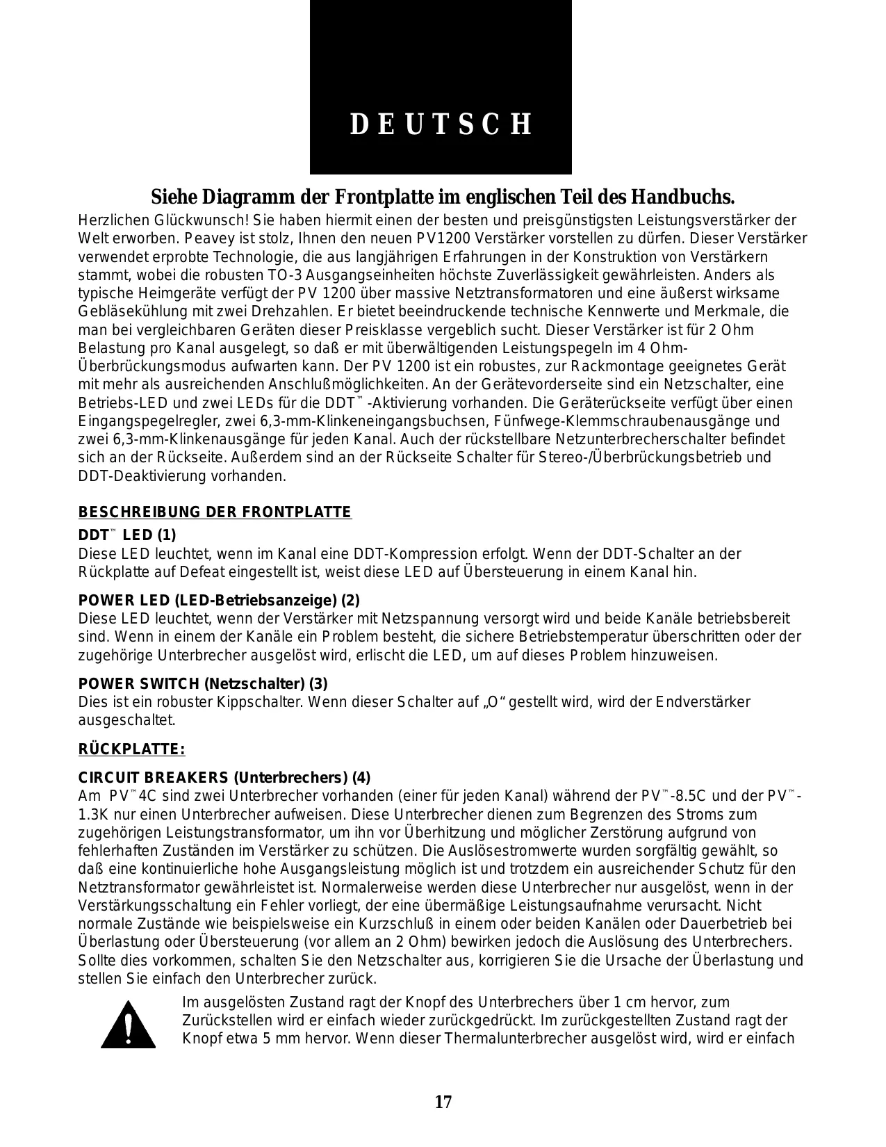 DEUTSCH Siehe Diagramm der Frontplatte im englischen Teil des Handbuchs. Herzlichen Glückwunsch! Sie haben hiermit einen der besten und preisgünstigsten Leistungsverstärker der Welt erworben. Peavey ist stolz, Ihnen den neuen PV1200 Verstärker vorstellen zu dürfen. Dieser Verstärker verwendet erprobte Technologie, die aus langjährigen Erfahrungen in der Konstruktion von Verstärkern stammt, wobei die robusten TO-3 Ausgangseinheiten höchste Zuverlässigkeit gewährleisten. Anders als typische Heimgeräte verfügt der PV 1200 über massive Netztransformatoren und eine äußerst wirksame Gebläsekühlung mit zwei Drehzahlen. Er bietet beeindruckende technische Kennwerte und Merkmale, die man bei vergleichbaren Geräten dieser Preisklasse vergeblich sucht. Dieser Verstärker ist für 2 Ohm Belastung pro Kanal ausgelegt, so daß er mit überwältigenden Leistungspegeln im 4 OhmÜberbrückungsmodus aufwarten kann. Der PV 1200 ist ein robustes, zur Rackmontage geeignetes Gerät mit mehr als ausreichenden Anschlußmöglichkeiten. An der Gerätevorderseite sind ein Netzschalter, eine Betriebs-LED und zwei LEDs für die DDT™ -Aktivierung vorhanden. Die Geräterückseite verfügt über einen Eingangspegelregler, zwei 6,3-mm-Klinkeneingangsbuchsen, Fünfwege-Klemmschraubenausgänge und zwei 6,3-mm-Klinkenausgänge für jeden Kanal. Auch der rückstellbare Netzunterbrecherschalter befindet sich an der Rückseite. Außerdem sind an der Rückseite Schalter für Stereo-/Überbrückungsbetrieb und DDT-Deaktivierung vorhanden.