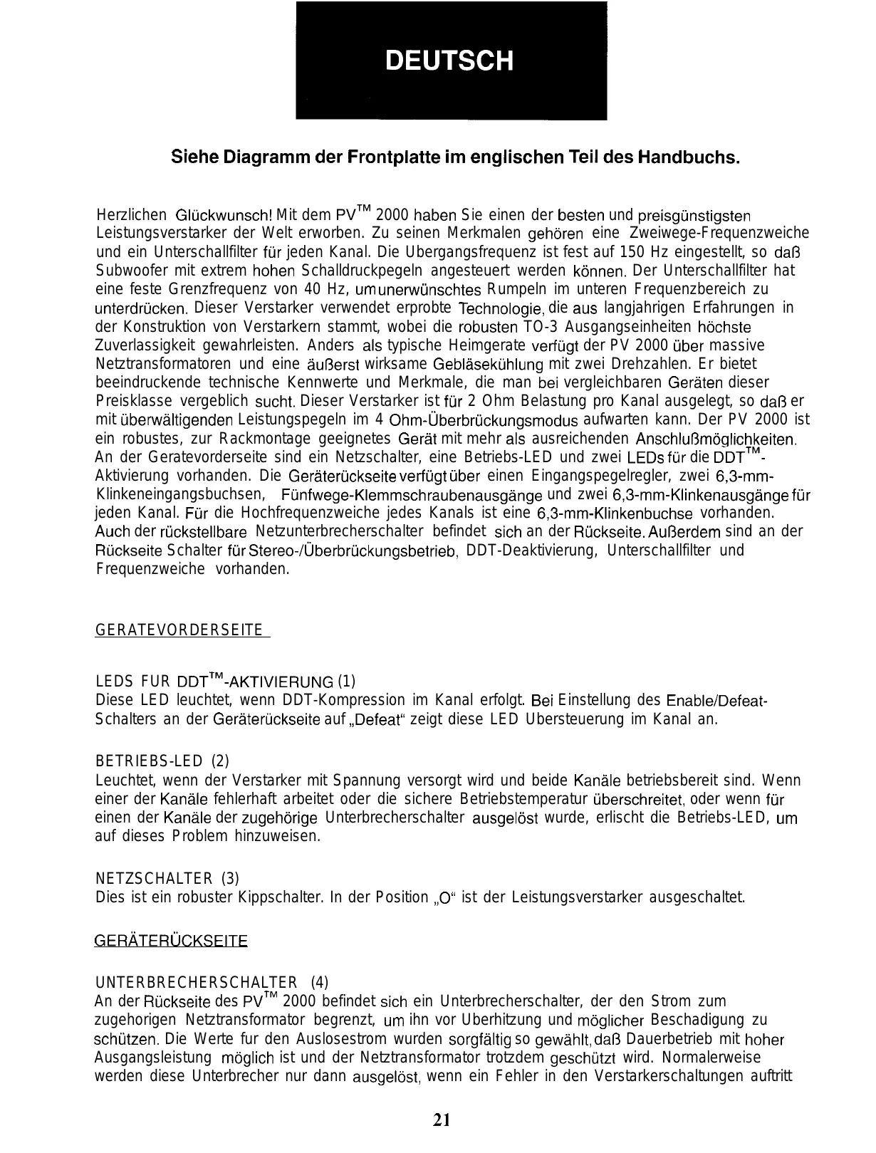 Siehe Diagramm der Frontplatte im englischen Teil des Handbuchs. Herzlichen Gluckwunsch! Mit dem PVTM 2000 haben Sie einen der besten und preisgijnstigsten Leistungsverstarker der Welt erworben. Zu seinen Merkmalen gehoren eine Zweiwege-Frequenzweiche und ein Unterschallfilter fur jeden Kanal. Die Ubergangsfrequenz ist fest auf 150 Hz eingestellt, so daB Subwoofer mit extrem hohen Schalldruckpegeln angesteuert werden konnen. Der Unterschallfilter hat eine feste Grenzfrequenz von 40 Hz, urn unerwunschtes Rumpeln im unteren Frequenzbereich zu unterdrticken. Dieser Verstarker verwendet erprobte Technologie, die aus langjahrigen Erfahrungen in der Konstruktion von Verstarkern stammt, wobei die robusten TO-3 Ausgangseinheiten hochste Zuverlassigkeit gewahrleisten. Anders als typische Heimgerate verftigt der PV 2000 iiber massive Netztransformatoren und eine auf3erst wirksame Geblasektihlung mit zwei Drehzahlen. Er bietet beeindruckende technische Kennwerte und Merkmale, die man bei vergleichbaren Get&en dieser Preisklasse vergeblich sucht. Dieser Verstarker ist fur 2 Ohm Belastung pro Kanal ausgelegt, so daB er mit tiberwaltigenden Leistungspegeln im 4 Ohm-Uberbruckungsmodus aufwarten kann. Der PV 2000 ist ein robustes, zur Rackmontage geeignetes Gerat mit mehr als ausreichenden AnschluBmoglichkeiten. An der Geratevorderseite sind ein Netzschalter, eine Betriebs-LED und zwei LEDs fur die DDTTMAktivierung vorhanden. Die Gerateruckseite verfiigt tiber einen Eingangspegelregler, zwei 6,3-mmKlinkeneingangsbuchsen, Ftinfwege-Klemmschraubenausgange und zwei 6,3-mm-Klinkenausgange fur jeden Kanal. Fur die Hochfrequenzweiche jedes Kanals ist eine 6,3-mm-Klinkenbuchse vorhanden. Auch der rtickstellbare Netzunterbrecherschalter befindet sich an der Riickseite. AuBerdem sind an der Ruckseite Schalter fur Stereo-/Uberbriickungsbetrieb, DDT-Deaktivierung, Unterschallfilter und Frequenzweiche vorhanden. GERATEVORDERSEITE LEDS FUR DDTTM-AKTIVIERUNG (1) Diese LED leuchtet, wenn DDT-Kompression im Kanal erfolgt. Bei Einstellung des Enable/DefeatSchalters an der Gerateruckseite auf ,,Defeat” zeigt diese LED Ubersteuerung im Kanal an. BETRIEBS-LED (2) Leuchtet, wenn der Verstarker mit Spannung versorgt wird und beide Kanale betriebsbereit sind. Wenn einer der Kanale fehlerhaft arbeitet oder die sichere Betriebstemperatur uberschreitet, oder wenn fur einen der Kanale der zugehorige Unterbrecherschalter ausgelost wurde, erlischt die Betriebs-LED, urn auf dieses Problem hinzuweisen. NETZSCHALTER (3) Dies ist ein robuster Kippschalter. In der Position ,,O” ist der Leistungsverstarker ausgeschaltet. GERATERUCKSEITE UNTERBRECHERSCHALTER (4) An der Ruckseite des PVTM 2000 befindet sich ein Unterbrecherschalter, der den Strom zum zugehorigen Netztransformator begrenzt, urn ihn vor Uberhitzung und moglicher Beschadigung zu schutzen. Die Werte fur den Auslosestrom wurden sorgfaltig so gewahlt, daf3 Dauerbetrieb mit hoher Ausgangsleistung moglich ist und der Netztransformator trotzdem geschutzt wird. Normalerweise werden diese Unterbrecher nur dann ausgelost, wenn ein Fehler in den Verstarkerschaltungen auftritt