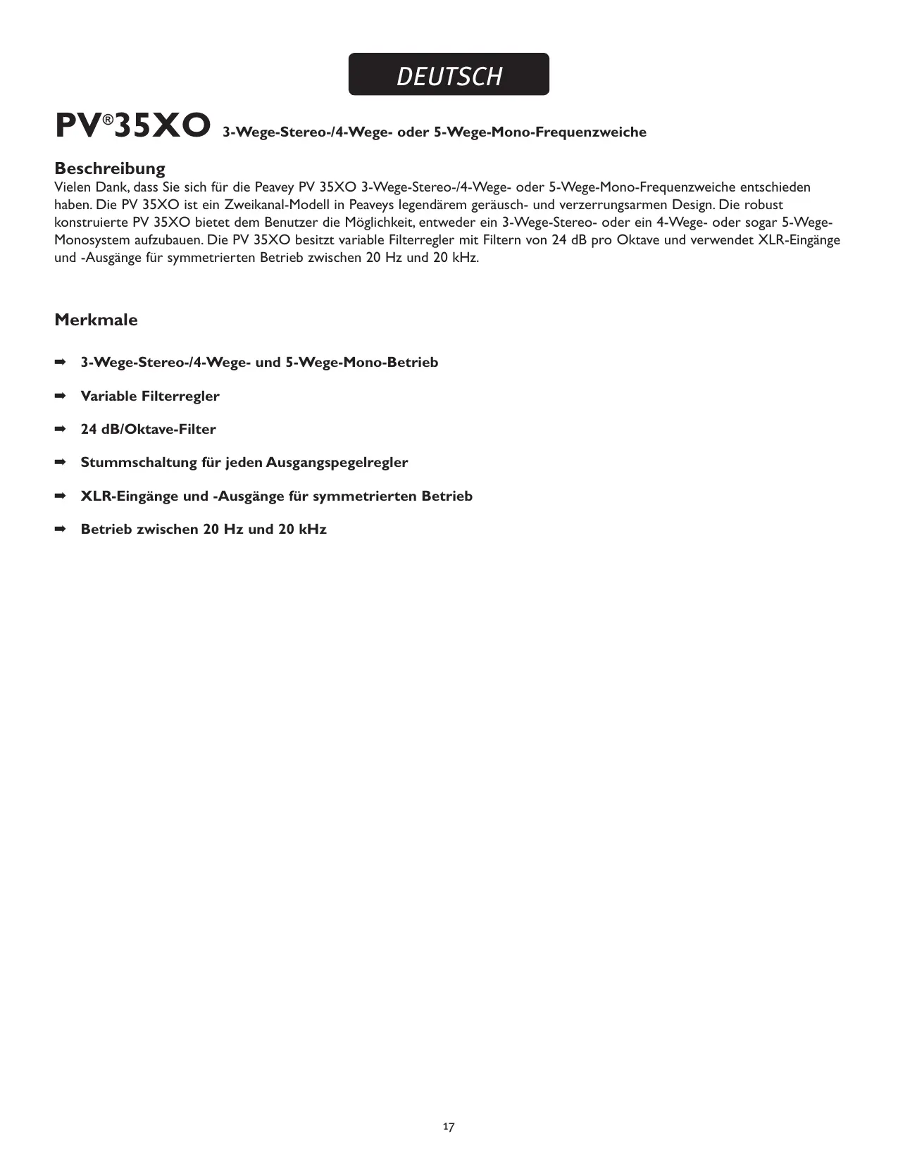 DEUTSCH PV®35XO 3-Wege-Stereo-/4-Wege- oder 5-Wege-Mono-Frequenzweiche Beschreibung Vielen Dank, dass Sie sich für die Peavey PV 35XO 3-Wege-Stereo-/4-Wege- oder 5-Wege-Mono-Frequenzweiche entschieden haben. Die PV 35XO ist ein Zweikanal-Modell in Peaveys legendärem geräusch- und verzerrungsarmen Design. Die robust konstruierte PV 35XO bietet dem Benutzer die Möglichkeit, entweder ein 3-Wege-Stereo- oder ein 4-Wege- oder sogar 5-WegeMonosystem aufzubauen. Die PV 35XO besitzt variable Filterregler mit Filtern von 24 dB pro Oktave und verwendet XLR-Eingänge und -Ausgänge für symmetrierten Betrieb zwischen 20 Hz und 20 kHz. Merkmale ➡ 3-Wege-Stereo-/4-Wege- und 5-Wege-Mono-Betrieb ➡ Variable Filterregler ➡ 24 dB/Oktave-Filter ➡ Stummschaltung für jeden Ausgangspegelregler ➡ XLR-Eingänge und -Ausgänge für symmetrierten Betrieb ➡ Betrieb zwischen 20 Hz und 20 kHz