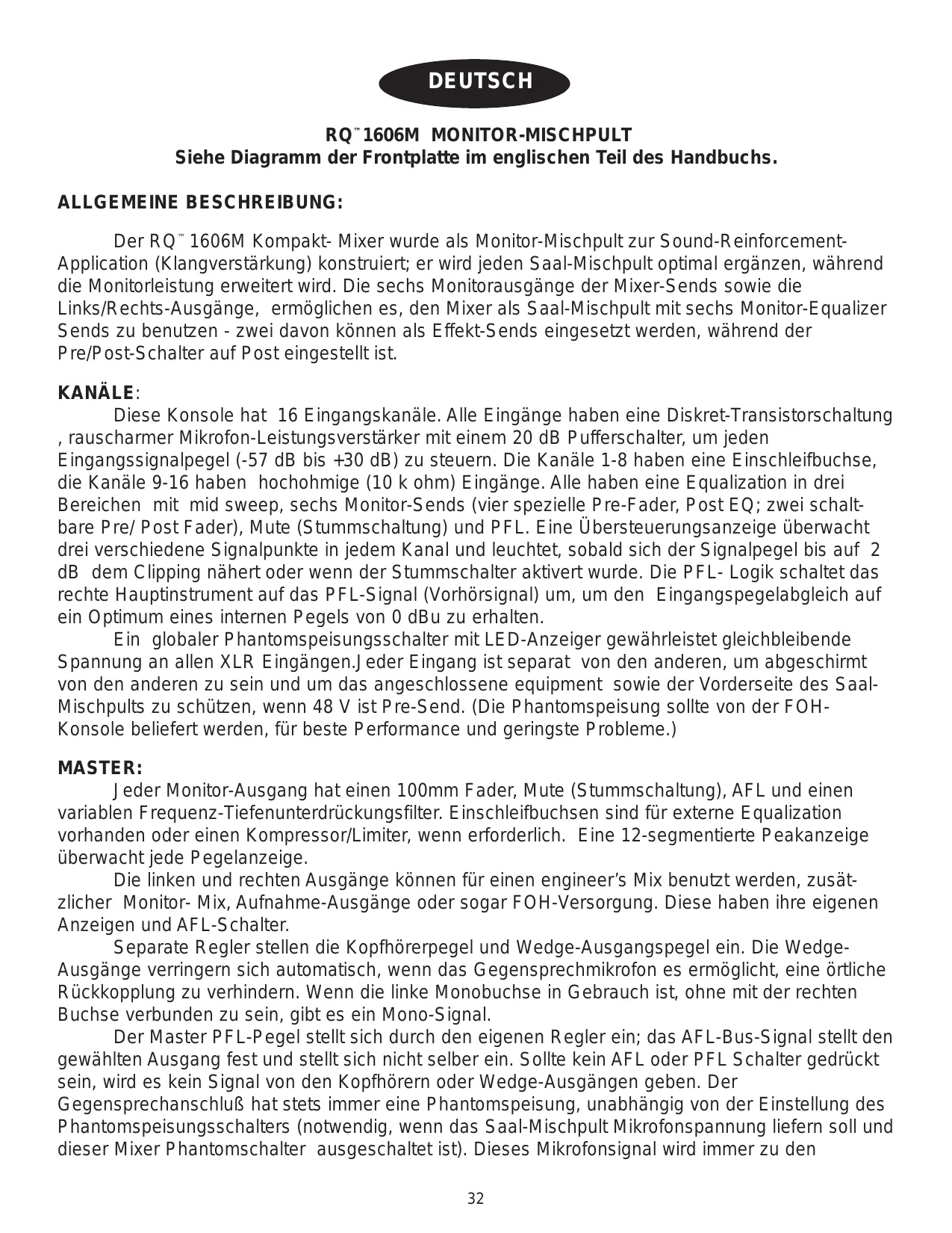 Siehe Diagramm der Frontplatte im englischen Teil des Handbuchs. ALLGEMEINE BESCHREIBUNG: Der RQ™ 1606M Kompakt- Mixer wurde als Monitor-Mischpult zur Sound-ReinforcementApplication (Klangverstärkung) konstruiert; er wird jeden Saal-Mischpult optimal ergänzen, während die Monitorleistung erweitert wird. Die sechs Monitorausgänge der Mixer-Sends sowie die Links/Rechts-Ausgänge, ermöglichen es, den Mixer als Saal-Mischpult mit sechs Monitor-Equalizer Sends zu benutzen - zwei davon können als Effekt-Sends eingesetzt werden, während der Pre/Post-Schalter auf Post eingestellt ist. KANÄLE: Diese Konsole hat 16 Eingangskanäle. Alle Eingänge haben eine Diskret-Transistorschaltung , rauscharmer Mikrofon-Leistungsverstärker mit einem 20 dB Pufferschalter, um jeden Eingangssignalpegel (-57 dB bis +30 dB) zu steuern. Die Kanäle 1-8 haben eine Einschleifbuchse, die Kanäle 9-16 haben hochohmige (10 k ohm) Eingänge. Alle haben eine Equalization in drei Bereichen mit mid sweep, sechs Monitor-Sends (vier spezielle Pre-Fader, Post EQ; zwei schaltbare Pre/ Post Fader), Mute (Stummschaltung) und PFL. Eine Übersteuerungsanzeige überwacht drei verschiedene Signalpunkte in jedem Kanal und leuchtet, sobald sich der Signalpegel bis auf 2 dB dem Clipping nähert oder wenn der Stummschalter aktivert wurde. Die PFL- Logik schaltet das rechte Hauptinstrument auf das PFL-Signal (Vorhörsignal) um, um den Eingangspegelabgleich auf ein Optimum eines internen Pegels von 0 dBu zu erhalten. Ein globaler Phantomspeisungsschalter mit LED-Anzeiger gewährleistet gleichbleibende Spannung an allen XLR Eingängen.Jeder Eingang ist separat von den anderen, um abgeschirmt von den anderen zu sein und um das angeschlossene equipment sowie der Vorderseite des SaalMischpults zu schützen, wenn 48 V ist Pre-Send. (Die Phantomspeisung sollte von der FOHKonsole beliefert werden, für beste Performance und geringste Probleme.) MASTER: Jeder Monitor-Ausgang hat einen 100mm Fader, Mute (Stummschaltung), AFL und einen variablen Frequenz-Tiefenunterdrückungsfilter. Einschleifbuchsen sind für externe Equalization vorhanden oder einen Kompressor/Limiter, wenn erforderlich. Eine 12-segmentierte Peakanzeige überwacht jede Pegelanzeige. Die linken und rechten Ausgänge können für einen engineer’s Mix benutzt werden, zusätzlicher Monitor- Mix, Aufnahme-Ausgänge oder sogar FOH-Versorgung. Diese haben ihre eigenen Anzeigen und AFL-Schalter. Separate Regler stellen die Kopfhörerpegel und Wedge-Ausgangspegel ein. Die WedgeAusgänge verringern sich automatisch, wenn das Gegensprechmikrofon es ermöglicht, eine örtliche Rückkopplung zu verhindern. Wenn die linke Monobuchse in Gebrauch ist, ohne mit der rechten Buchse verbunden zu sein, gibt es ein Mono-Signal. Der Master PFL-Pegel stellt sich durch den eigenen Regler ein; das AFL-Bus-Signal stellt den gewählten Ausgang fest und stellt sich nicht selber ein. Sollte kein AFL oder PFL Schalter gedrückt sein, wird es kein Signal von den Kopfhörern oder Wedge-Ausgängen geben. Der Gegensprechanschluß hat stets immer eine Phantomspeisung, unabhängig von der Einstellung des Phantomspeisungsschalters (notwendig, wenn das Saal-Mischpult Mikrofonspannung liefern soll und dieser Mixer Phantomschalter ausgeschaltet ist). Dieses Mikrofonsignal wird immer zu den