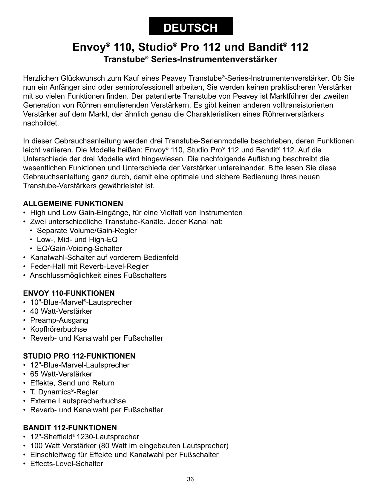 Cette brochure présente trois modèles très similaires de la série TransTube. Il s’agit des modèles Envoy® 110, Studio Pro® 112 et Bandit® 112. Les différences entre les appareils sont indiquées, s’il y a lieu. La liste ci-dessous décrit les caractéristiques et les différences principales entre les amplis. Lisez entièrement ce manuel pour garantir un fonctionnement optimal et en toute sécurité de votre nouvel ampli TransTube. CARACTERISTIQUES COMMUNES • Entrées de gain élevé et bas pour s’adapter à une large variété d’instruments • Deux canaux TransTube distincts disposant chacun de: • Commandes de volume/gain séparées • EQ basse, médium et aigu • Commutateurs d’agencement sonore EQ/Gain • Commutateur de sélection de canal sur le panneau avant • Reverb plus naturelle grâce à la commande de niveau de reverb • Possibilité d’un interrupteur à distance au pied CARACTERISTIQUES DE L’ENVOY 110 • Haut-parleur Blue Marvel® de 254 mm • Amplificateur de puissance de 40 watts • Sortie de préampli • Prise pour casque • Sélection de reverb et de canal par interrupteur au pied CARACTERISTIQUES DU STUDIO PRO 112 • Haut-parleur Blue Marvel® de 305 mm • Amplificateur de puissance de 65 watts • Envoi et retour d’effets • Commande T. Dynamics® • Prise pour haut-parleur externe • Sélection de reverb et de canal par interrupteur au pied CARACTERISTIQUES DU BANDIT 112 • Haut-parleur Sheffield® 1230 de 305 mm • Amplificateur de puissance de 100 watts (80 watts dans haut-parleur interne) • Sélection de boucle à effets et de canal par interrupteur au pied • Commande de niveau d’effets • Sortie de préampli • Entrée d’ampli de puissance 25