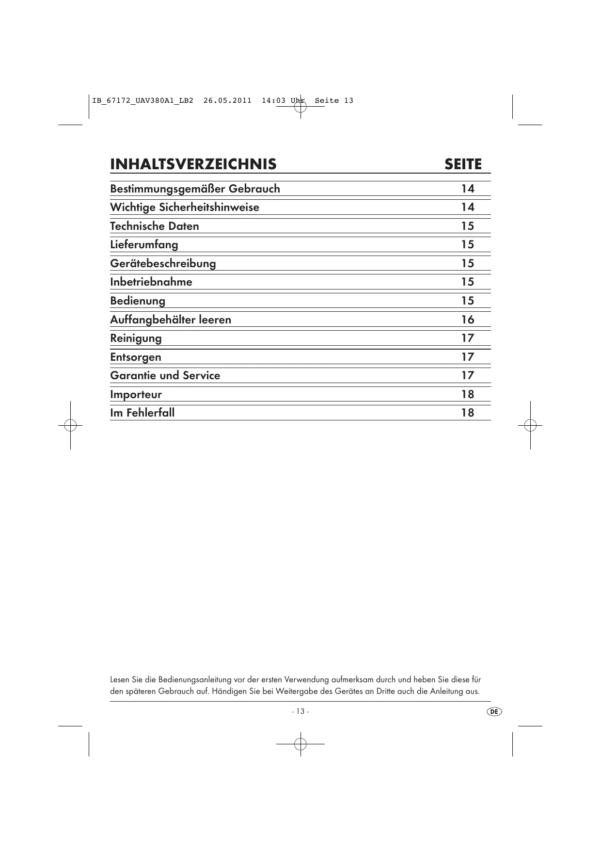 INHALTSVERZEICHNIS SEITE Bestimmungsgemälier Gebrauch 14 Wichtige Sicherheitshinweise 14 Technische Daten 15 Lieferumfang 15 Gerätebeschreibung 15 Inbetriebnahme 15 Bedienung 15 Auffangbehälter leeren 16 Reinigung 17 Entsorgen 17 Garantie und Service 17 Importeur 18 Im Fehlerfall 18