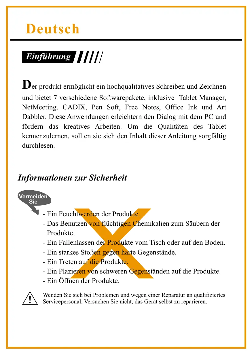 Re-plug in the cable. Deutsch Einführung Der produkt ermöglicht ein hochqualitatives Schreiben und Zeichnen und bietet 7 verschiedene Softwarepakete, inklusive Tablet Manager, NetMeeting, CADIX, Pen Soft, Free Notes, Office Ink und Art Dabbler. Diese Anwendungen erleichtern den Dialog mit dem PC und fördern das kreatives Arbeiten. Um die Qualitäten des Tablet kennenzulernen, sollten sie sich den Inhalt dieser Anleitung sorgfältig durchlesen. Informationen zur Sicherheit Vermeiden Sie - Ein Feuchtwerden der Produkte. - Das Benutzen von flüchtigen Chemikalien zum Säubern der Produkte. - Ein Fallenlassen der Produkte vom Tisch oder auf den Boden. - Ein starkes Stoßen gegen harte Gegenstände. - Ein Treten auf die Produkte. - Ein Plazieren von schweren Gegenständen auf die Produkte. - Ein Öffnen der Produkte. Wenden Sie sich bei Problemen und wegen einer Reparatur an qualifiziertes Servicepersonal. Versuchen Sie nicht, das Gerät selbst zu reparieren. Deutsch Kapitel 1: Installation Hardware