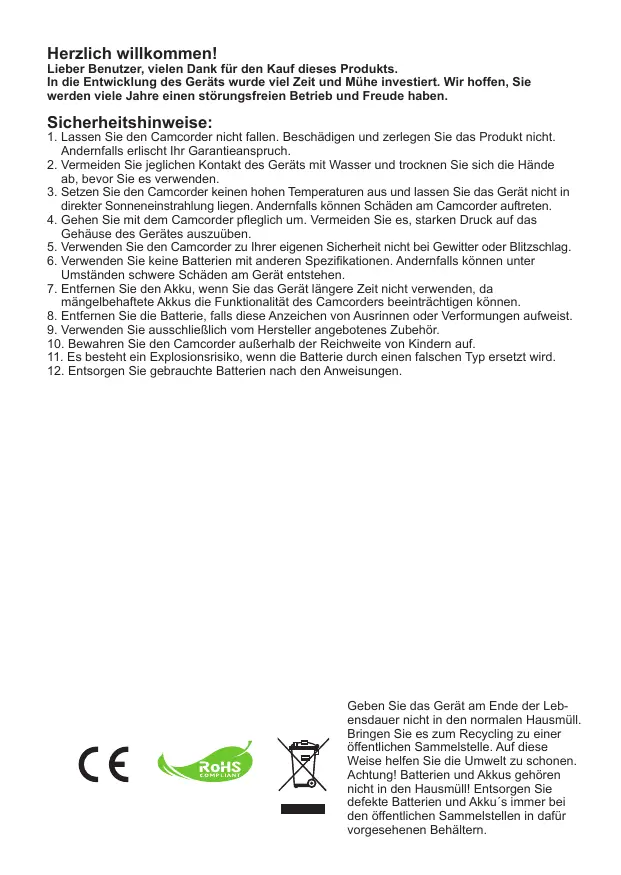 1. Lassen Sie den Camcorder nicht fallen. Beschädigen und zerlegen Sie das Produkt nicht. Andernfalls erlischt Ihr Garantieanspruch. 2. Vermeiden Sie jeglichen Kontakt des Geräts mit Wasser und trocknen Sie sich die Hände ab, bevor Sie es verwenden. 3. Setzen Sie den Camcorder keinen hohen Temperaturen aus und lassen Sie das Gerät nicht in direkter Sonneneinstrahlung liegen. Andernfalls können Schäden am Camcorder auftreten. 4. Gehen Sie mit dem Camcorder pfleglich um. Vermeiden Sie es, starken Druck auf das Gehäuse des Gerätes auszuüben. 5. Verwenden Sie den Camcorder zu Ihrer eigenen Sicherheit nicht bei Gewitter oder Blitzschlag. 6. Verwenden Sie keine Batterien mit anderen Spezifikationen. Andernfalls können unter Umständen schwere Schäden am Gerät entstehen. 7. Entfernen Sie den Akku, wenn Sie das Gerät längere Zeit nicht verwenden, da mängelbehaftete Akkus die Funktionalität des Camcorders beeinträchtigen können. 8. Entfernen Sie die Batterie, falls diese Anzeichen von Ausrinnen oder Verformungen aufweist. 9. Verwenden Sie ausschließlich vom Hersteller angebotenes Zubehör. 10. Bewahren Sie den Camcorder außerhalb der Reichweite von Kindern auf. 11. Es besteht ein Explosionsrisiko, wenn die Batterie durch einen falschen Typ ersetzt wird. 12. Entsorgen Sie gebrauchte Batterien nach den Anweisungen.
