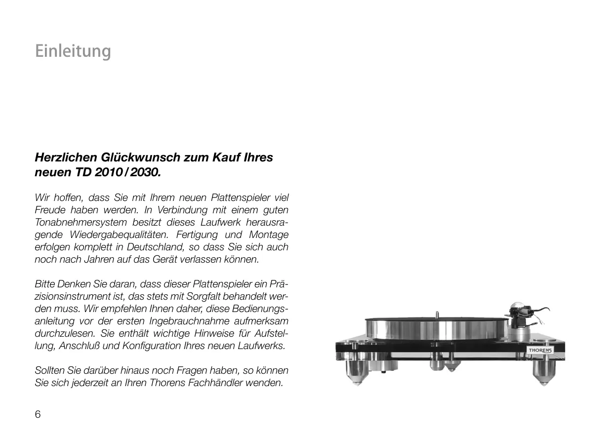 Einleitung Herzlichen Glückwunsch zum Kauf Ihres neuen TD 2010 / 2030. Wir hoffen, dass Sie mit Ihrem neuen Plattenspieler viel Freude haben werden. In Verbindung mit einem guten Tonabnehmersystem besitzt dieses Laufwerk herausragende Wiedergabequalitäten. Fertigung und Montage erfolgen komplett in Deutschland, so dass Sie sich auch noch nach Jahren auf das Gerät verlassen können. Bitte Denken Sie daran, dass dieser Plattenspieler ein Präzisionsinstrument ist, das stets mit Sorgfalt behandelt werden muss. Wir empfehlen Ihnen daher, diese Bedienungsanleitung vor der ersten Ingebrauchnahme aufmerksam durchzulesen. Sie enthält wichtige Hinweise für Aufstellung, Anschluß und Konfiguration Ihres neuen Laufwerks. Sollten Sie darüber hinaus noch Fragen haben, so können Sie sich jederzeit an Ihren Thorens Fachhändler wenden.