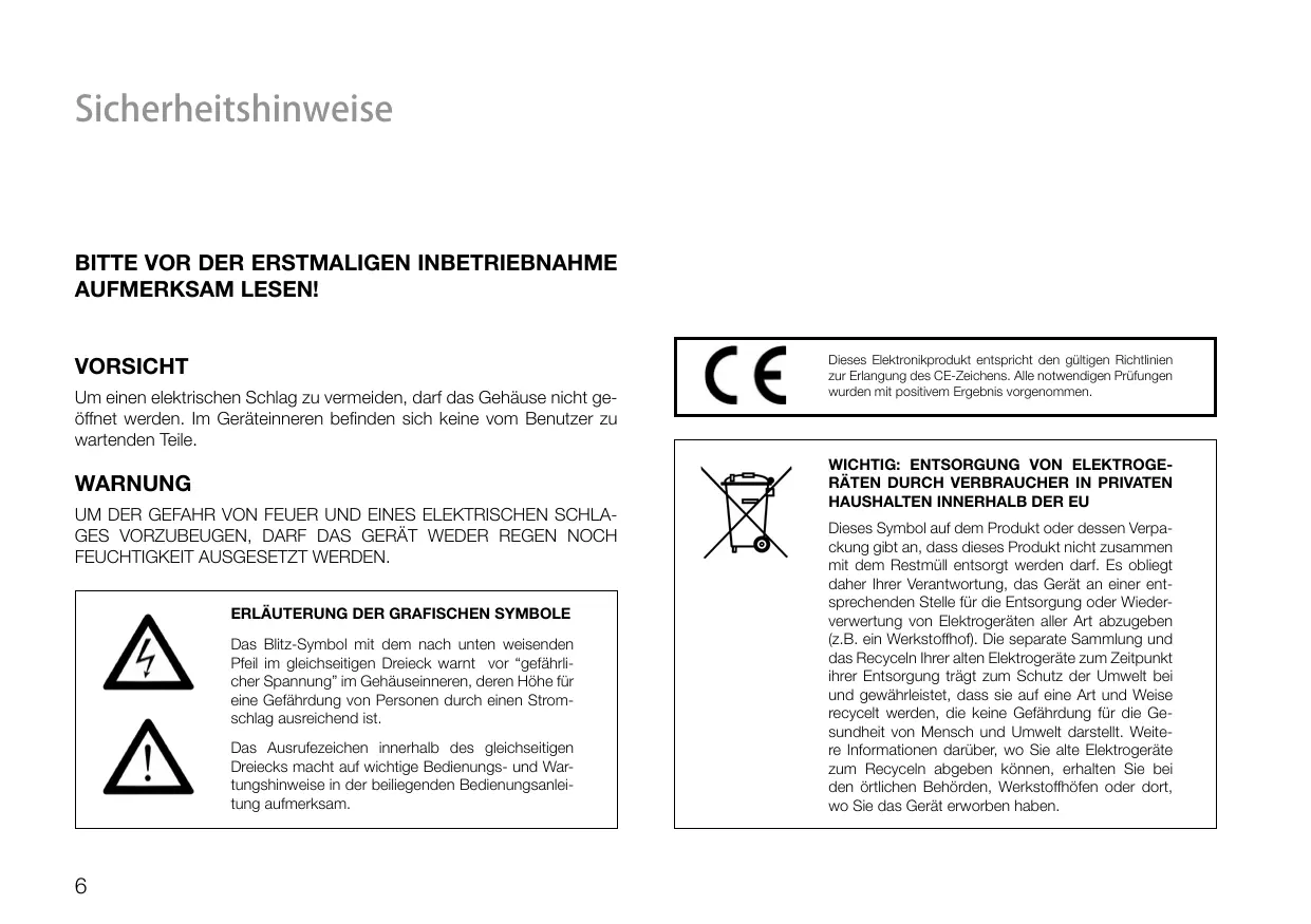 AUFMERKSAM LESEN! VORSICHT Um einen elektrischen Schlag zu vermeiden, darf das Gehäuse nicht geöffnet werden. Im Geräteinneren befinden sich keine vom Benutzer zu wartenden Teile. WARNUNG UM DER GEFAHR VON FEUER UND EINES ELEKTRISCHEN SCHLAGES VORZUBEUGEN, DARF DAS GERÄT WEDER REGEN NOCH FEUCHTIGKEIT AUSGESETZT WERDEN.