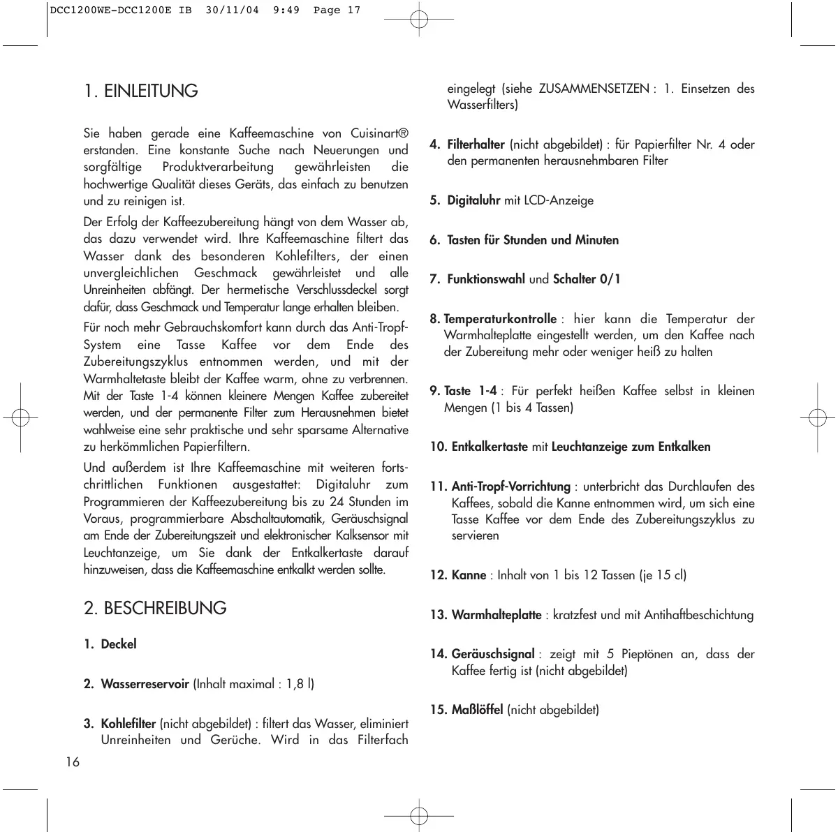 Sie haben gerade eine Kaffeemaschine von Cuisinart® erstanden. Eine konstante Suche nach Neuerungen und sorgfältige Produktverarbeitung gewährleisten die hochwertige Qualität dieses Geräts, das einfach zu benutzen und zu reinigen ist. Der Erfolg der Kaffeezubereitung hängt von dem Wasser ab, das dazu verwendet wird. Ihre Kaffeemaschine filtert das Wasser dank des besonderen Kohlefilters, der einen unvergleichlichen Geschmack gewährleistet und alle Unreinheiten abfängt. Der hermetische Verschlussdeckel sorgt dafür, dass Geschmack und Temperatur lange erhalten bleiben. Für noch mehr Gebrauchskomfort kann durch das Anti-TropfSystem eine Tasse Kaffee vor dem Ende des Zubereitungszyklus entnommen werden, und mit der Warmhaltetaste bleibt der Kaffee warm, ohne zu verbrennen. Mit der Taste 1-4 können kleinere Mengen Kaffee zubereitet werden, und der permanente Filter zum Herausnehmen bietet wahlweise eine sehr praktische und sehr sparsame Alternative zu herkömmlichen Papierfiltern. Und außerdem ist Ihre Kaffeemaschine mit weiteren fortschrittlichen Funktionen ausgestattet: Digitaluhr zum Programmieren der Kaffeezubereitung bis zu 24 Stunden im Voraus, programmierbare Abschaltautomatik, Geräuschsignal am Ende der Zubereitungszeit und elektronischer Kalksensor mit Leuchtanzeige, um Sie dank der Entkalkertaste darauf hinzuweisen, dass die Kaffeemaschine entkalkt werden sollte.